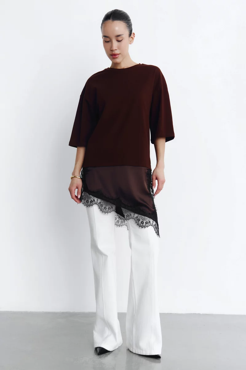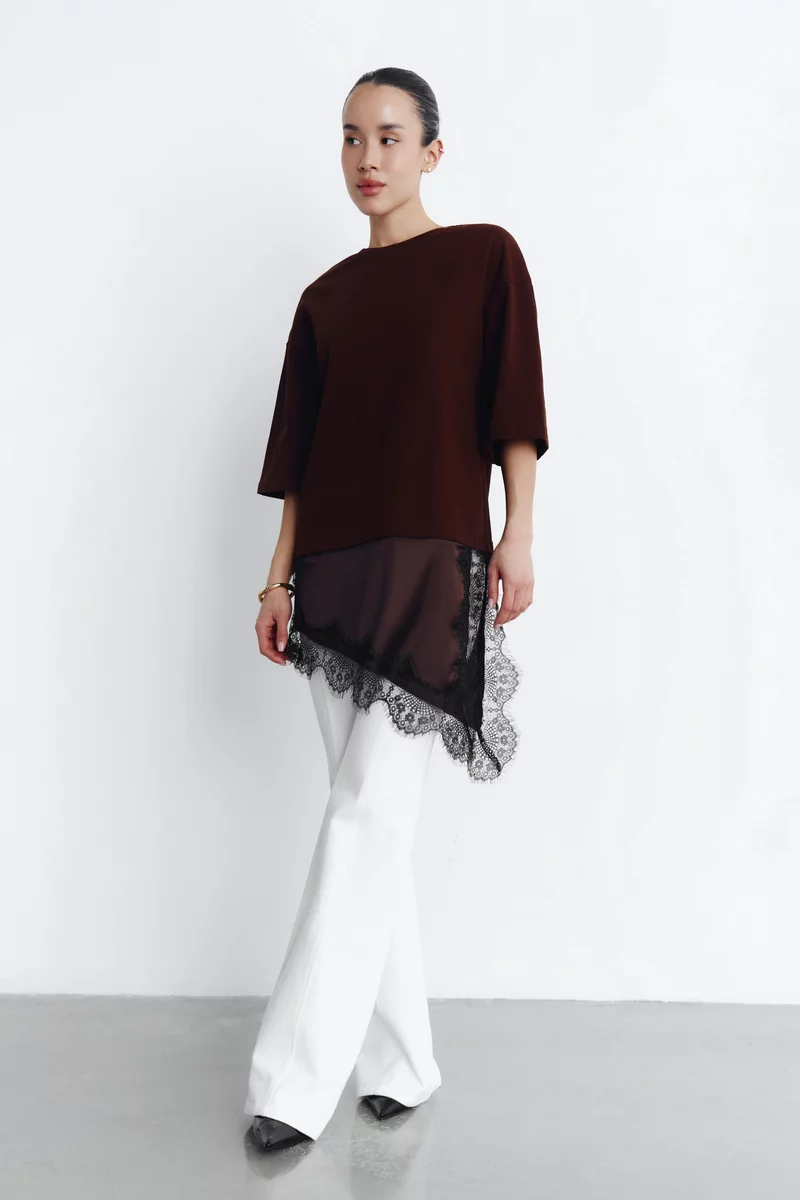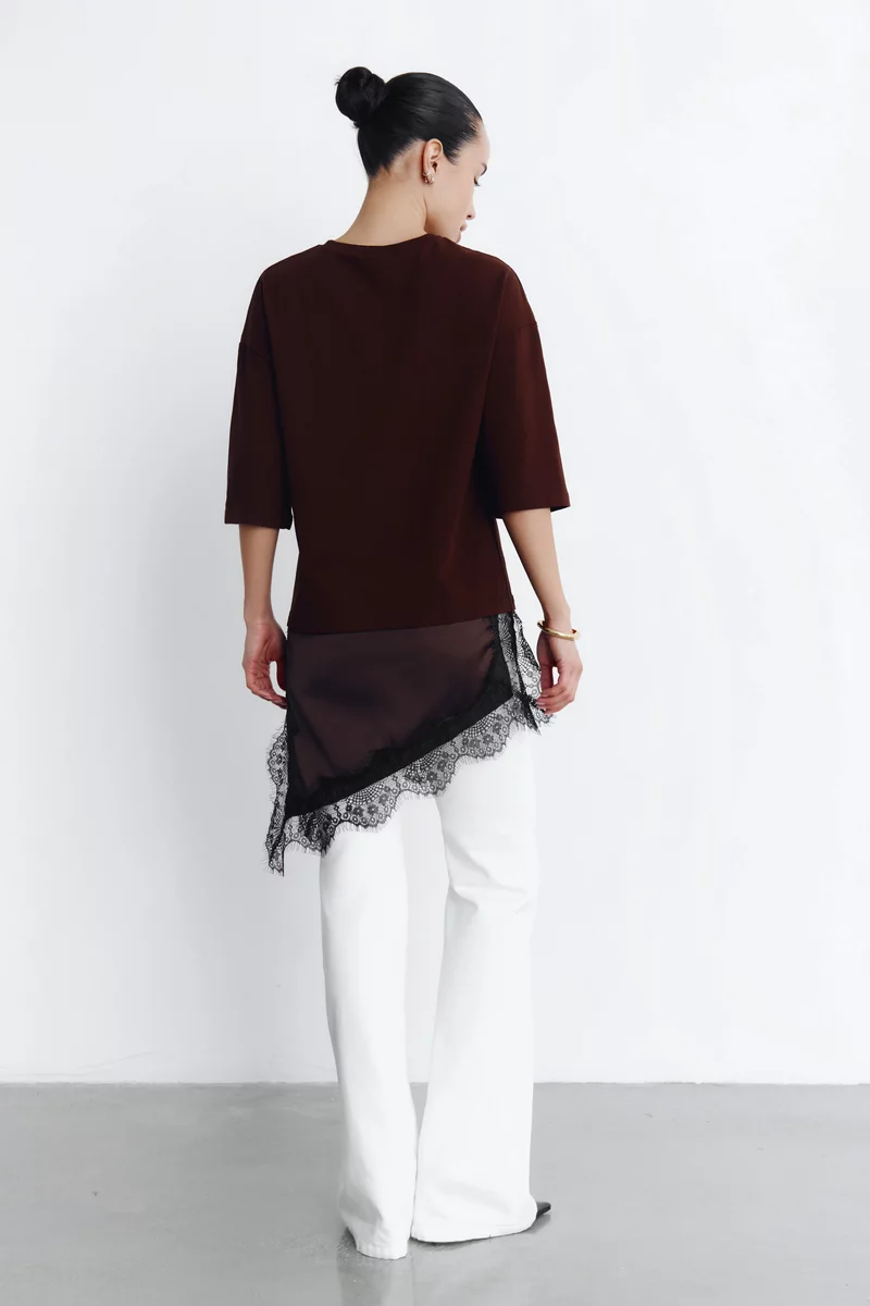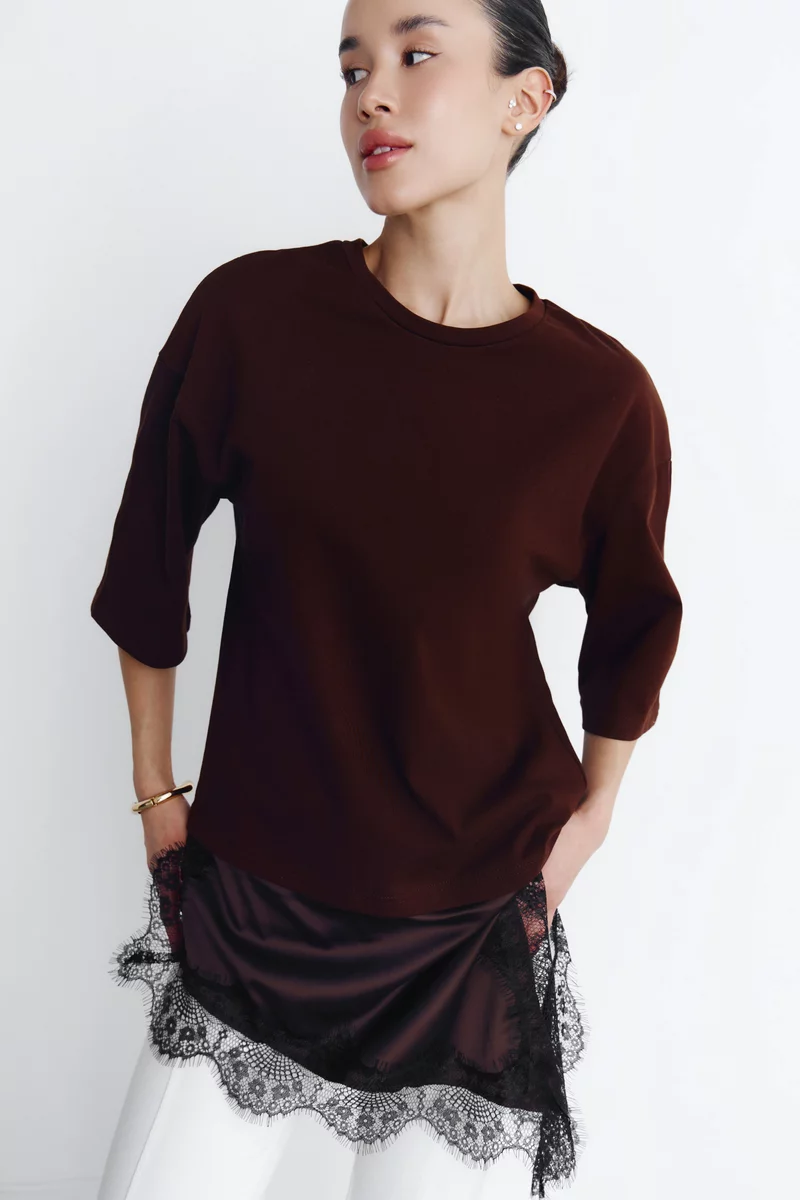 Коричнева бавовняна футболка з мереживною вставкою
