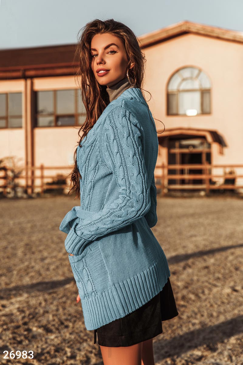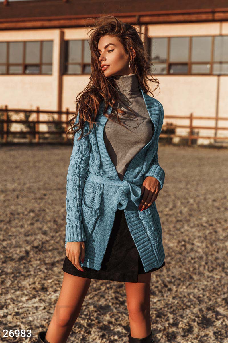 Затишний кардиган блакитного кольору з кишенями спереду з довгим рукавом на фіксованій манжете з широкою гумкою знизу і знімним поясом в тон.