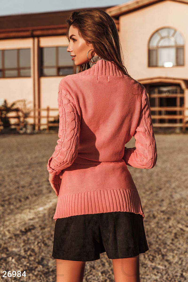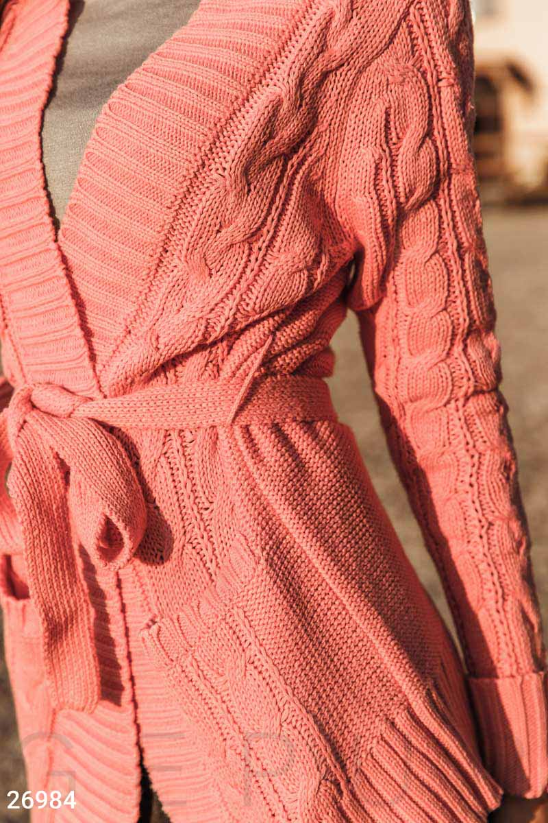 Затишний кардиган ніжного рожевого з кишенями спереду з довгим рукавом на фіксованій манжете з широкою гумкою знизу і знімним поясом в тон.