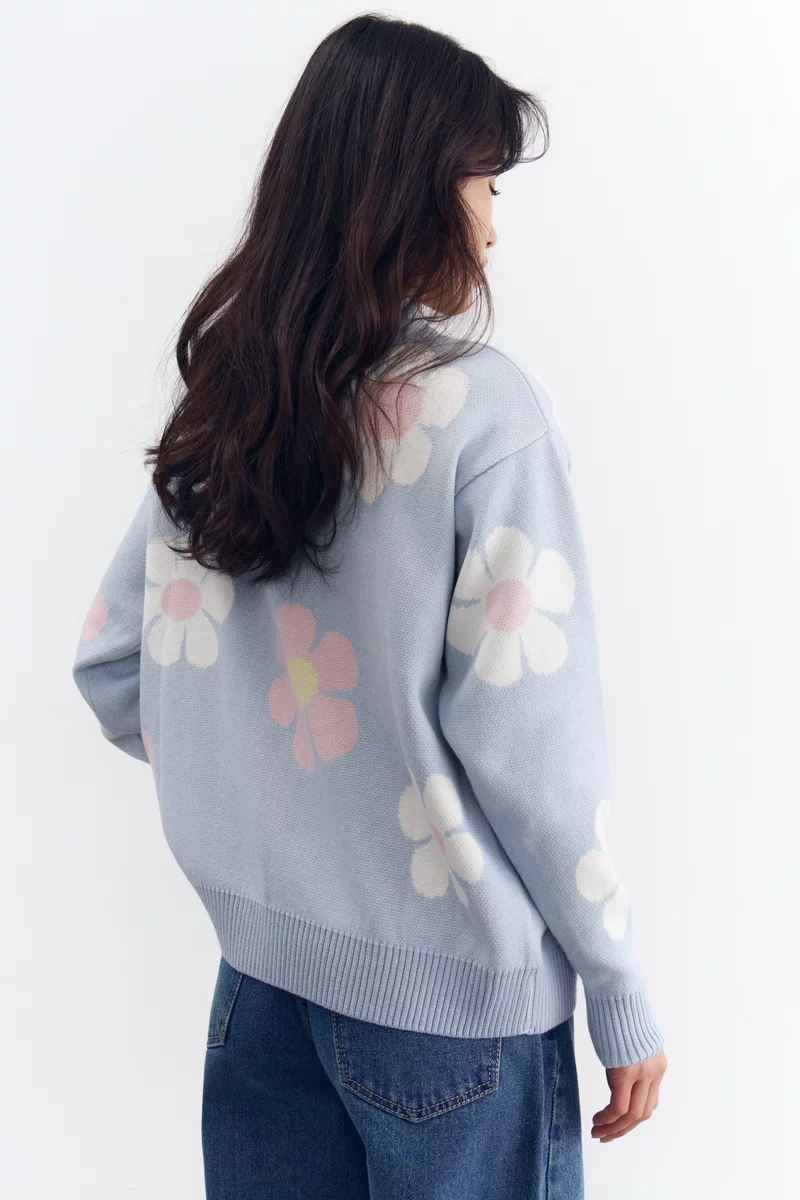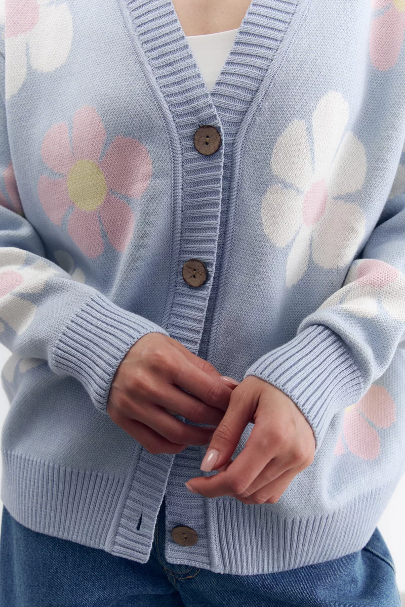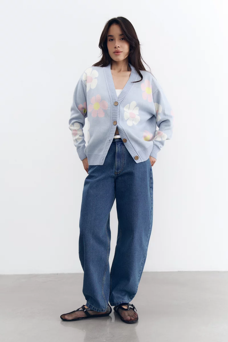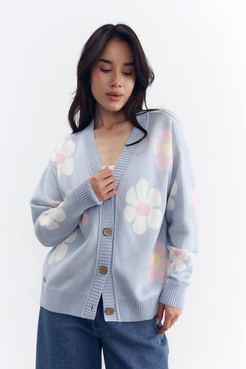 Кардиган оверсайз із V-подібним вирізом та заниженою лінією плеча. Акцентна деталь - квітковий принт. Зберігай у складеному вигляді, щоб уникнути витяжки