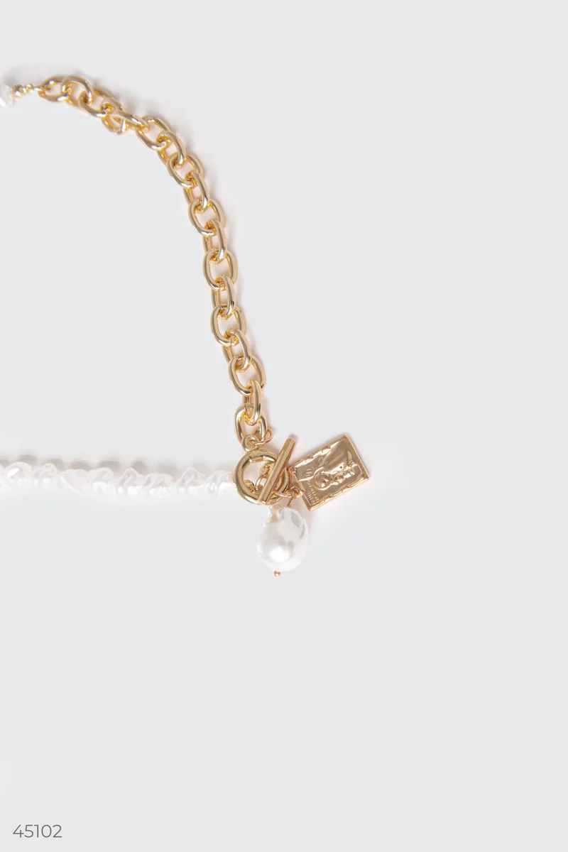Стильне кольє складається з ланцюжка з великими золотистими ланками і перлинами. Прикраса виконана з біжутерного сплаву, який не окислюється і не іржавіє. Гнучка основа. При правильному догляді прикраса довго служить. Зберігайте біжутерію в закритій скриньці, органайзері або шафці в розправленому вигляді.