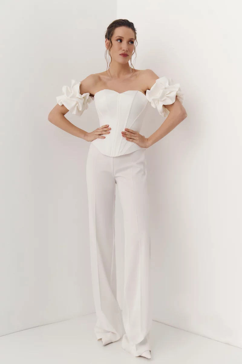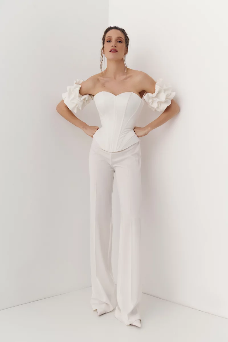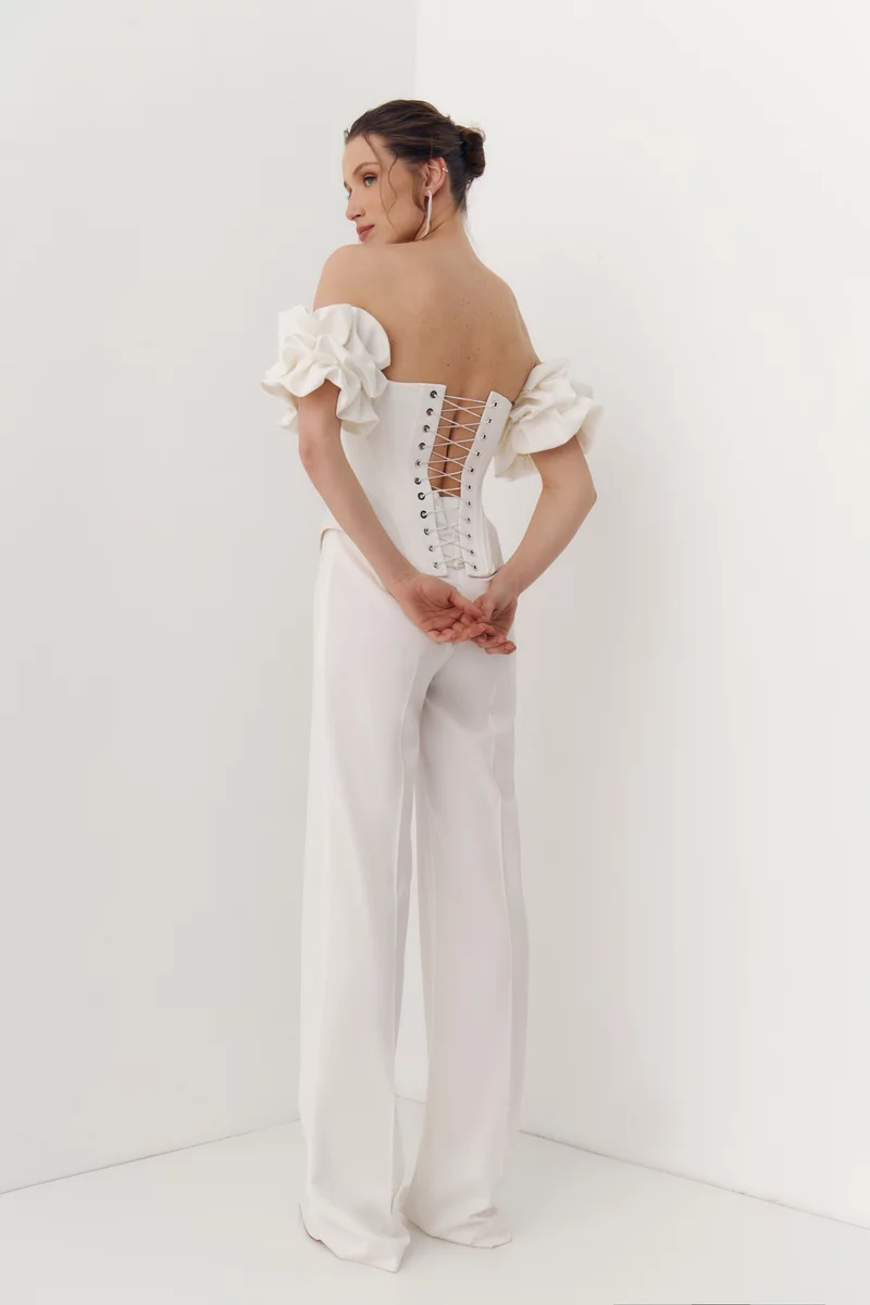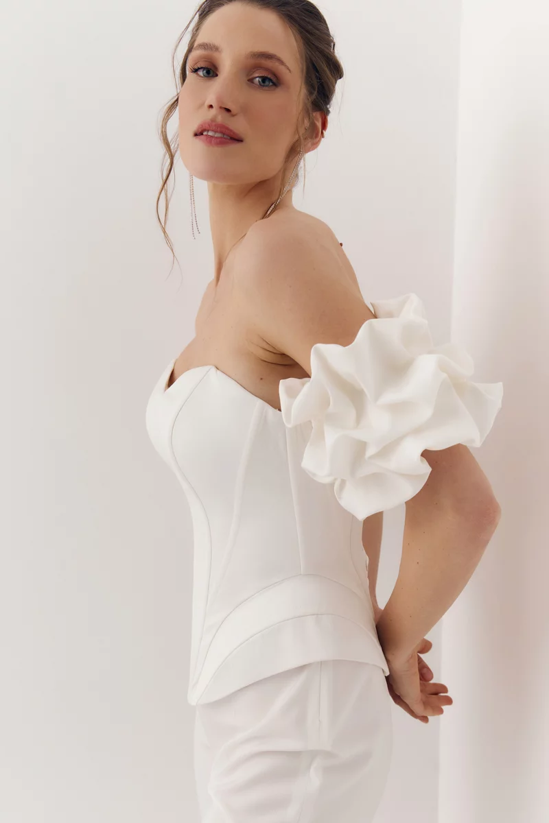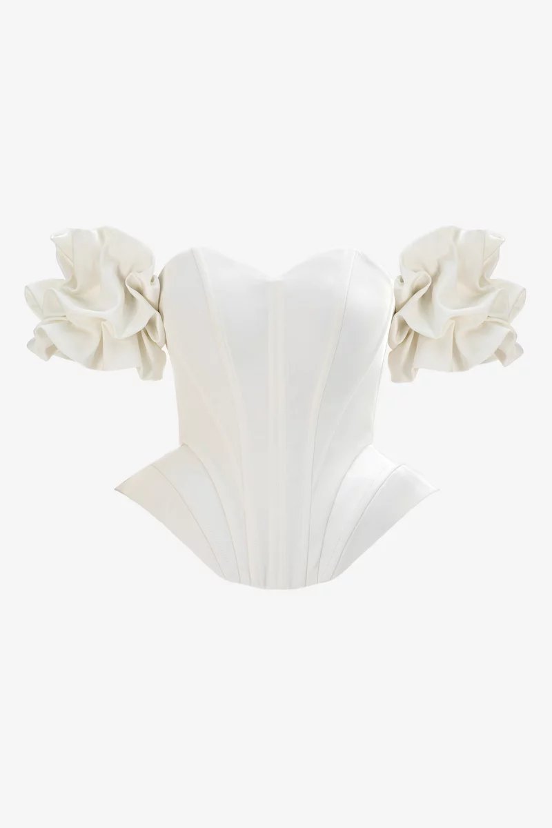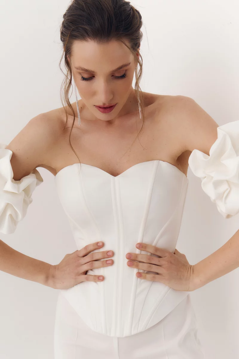 Сатиновий корсет з відкритими плечима. Акцентна деталь - знімні рукави з рюшами. Спинка стилізована шнурівкою, яка дозволяє регулювати об'єм. Корсет на кісточках, що ефектно моделюють силует та підкреслюють талію. На підкладці