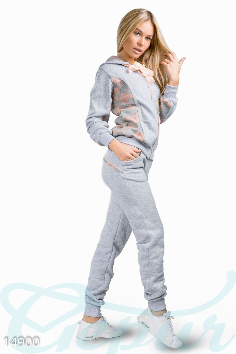 Теплый спортивный костюм - выгодная и модная покупка на холодный сезон. Курточка и брюки украшены неопреновыми вставками с вензельным рисунком. Объемный капюшон с атласными завязками защитит от ветра и холода. Застегивается куртка на молнию. Боковые карманы застегиваются на потаные змейки. Брюки с поясом на резинке и передними боковыми карманами внизу собираются на манжеты. Такой костюм - отличный выбор для активного отдыха, путешествий или просто прогулки в парке. Материал: трехнить на флисе, вставки - неопрен Длина: куртка - 60 см, длина рукава по внутреннему шву - 44 см, брюки - 96 см Цвет: серый меланж, вставки - персиковый