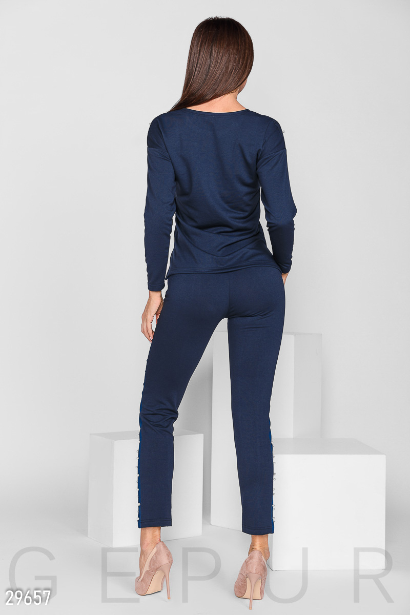 Трикотажный костюм-двойка: комфортный джемпер с длинными рукавами, накладным карманом, украшенным бусинами, мягкие брюки средней посадки на эластичной резинке, небольшими карманами в швах и контрастными лампасами с декором.