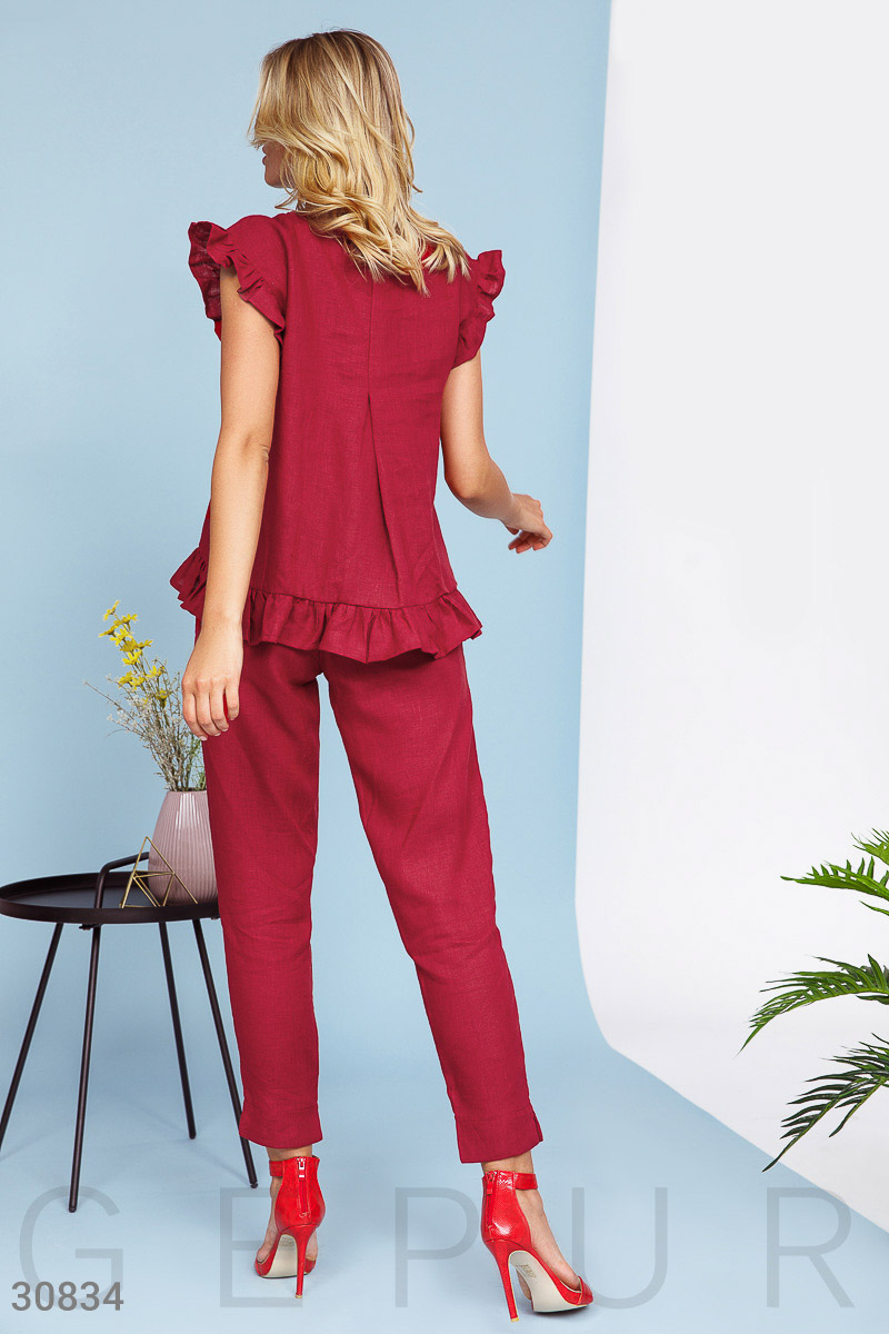 Легкий костюм, виконаний з дихаючої тканини: блуза вільного крою з короткими рукавами-оборками, акуратним круглим вирізом, подовженою спинкою, поділ доповнений оборками, звужені штани середньої посадки на еластичному поясі, двома прорізними кишенями з боків і невеликими розрізами.