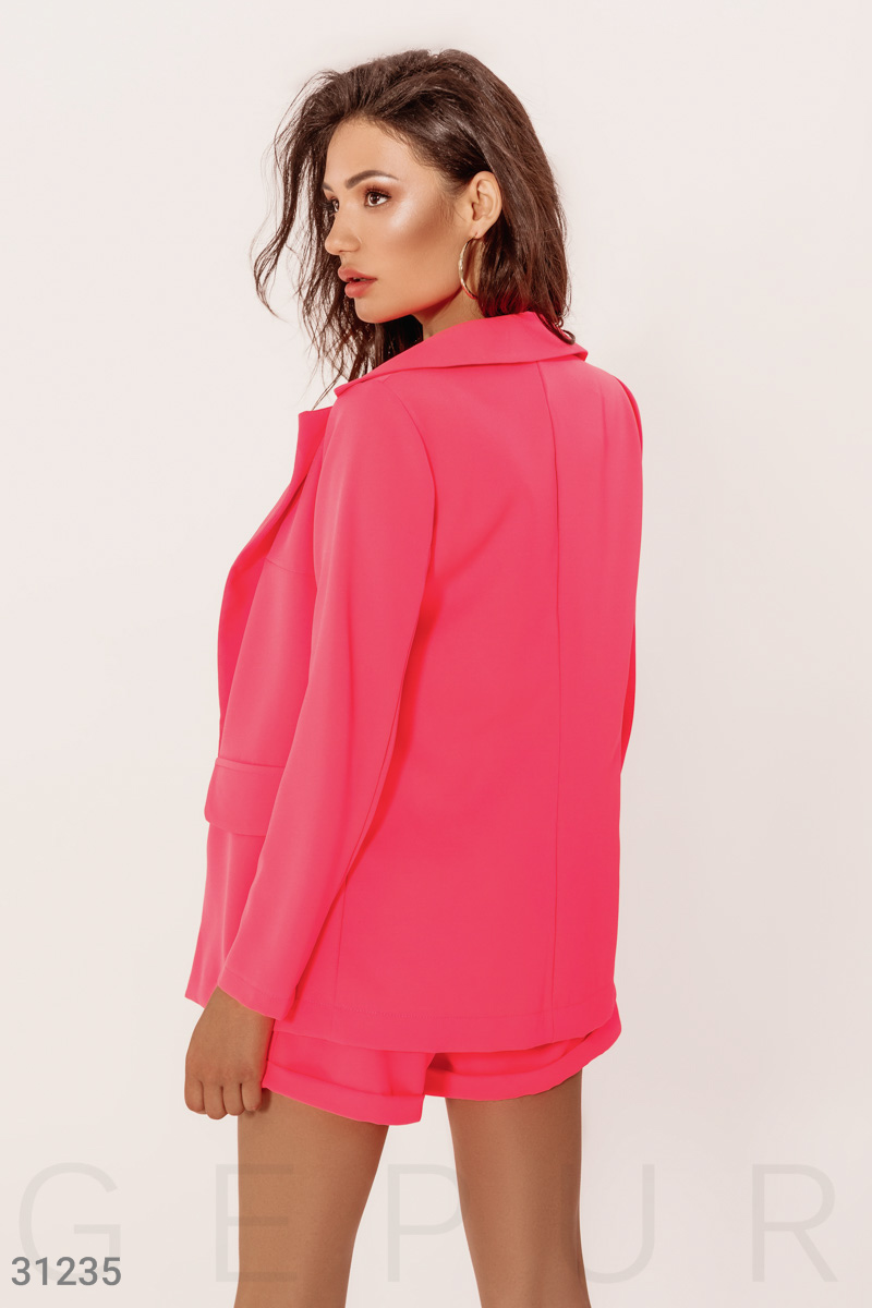 Стильный костюм яркого неонового оттенка: однобортный жакет классического кроя с отложным воротником, лацканами, длинным рукавом и двумя карманами-обманками с клапаном, шорты с высокой посадкой, фиксированными отворотами и двумя прорезными карманами по бокам. ...