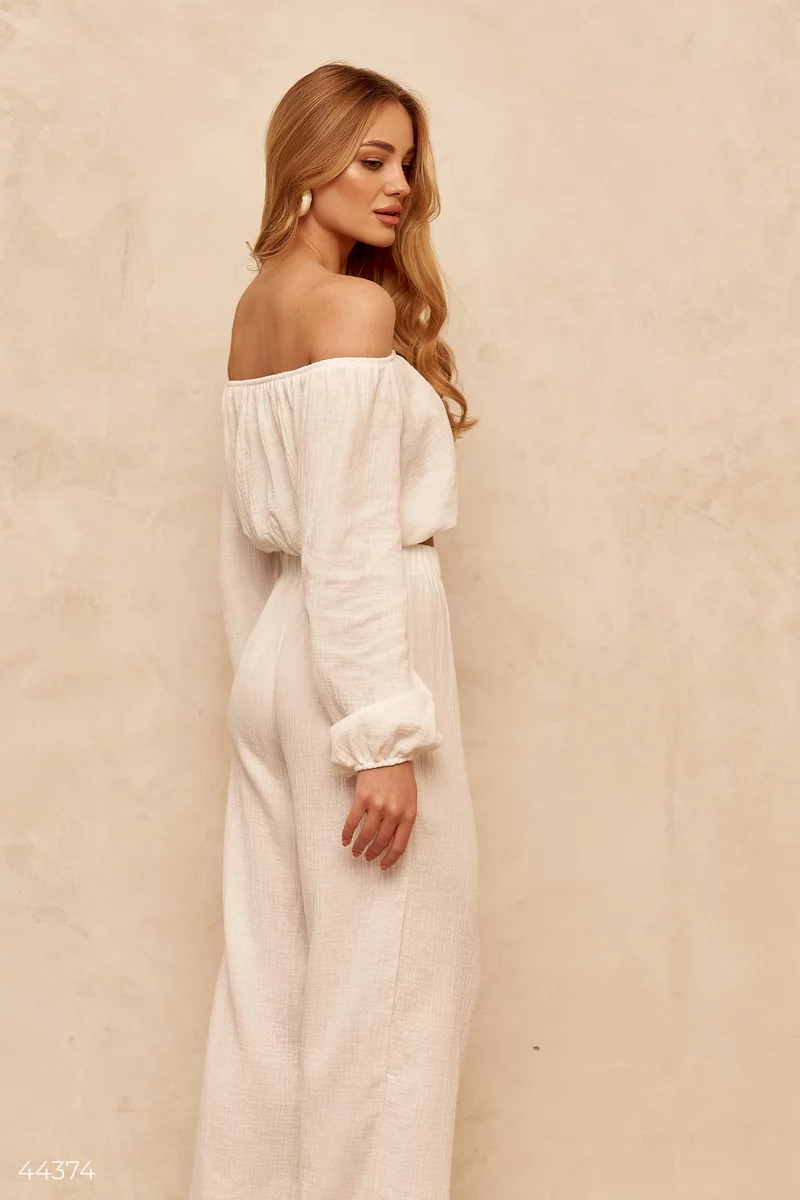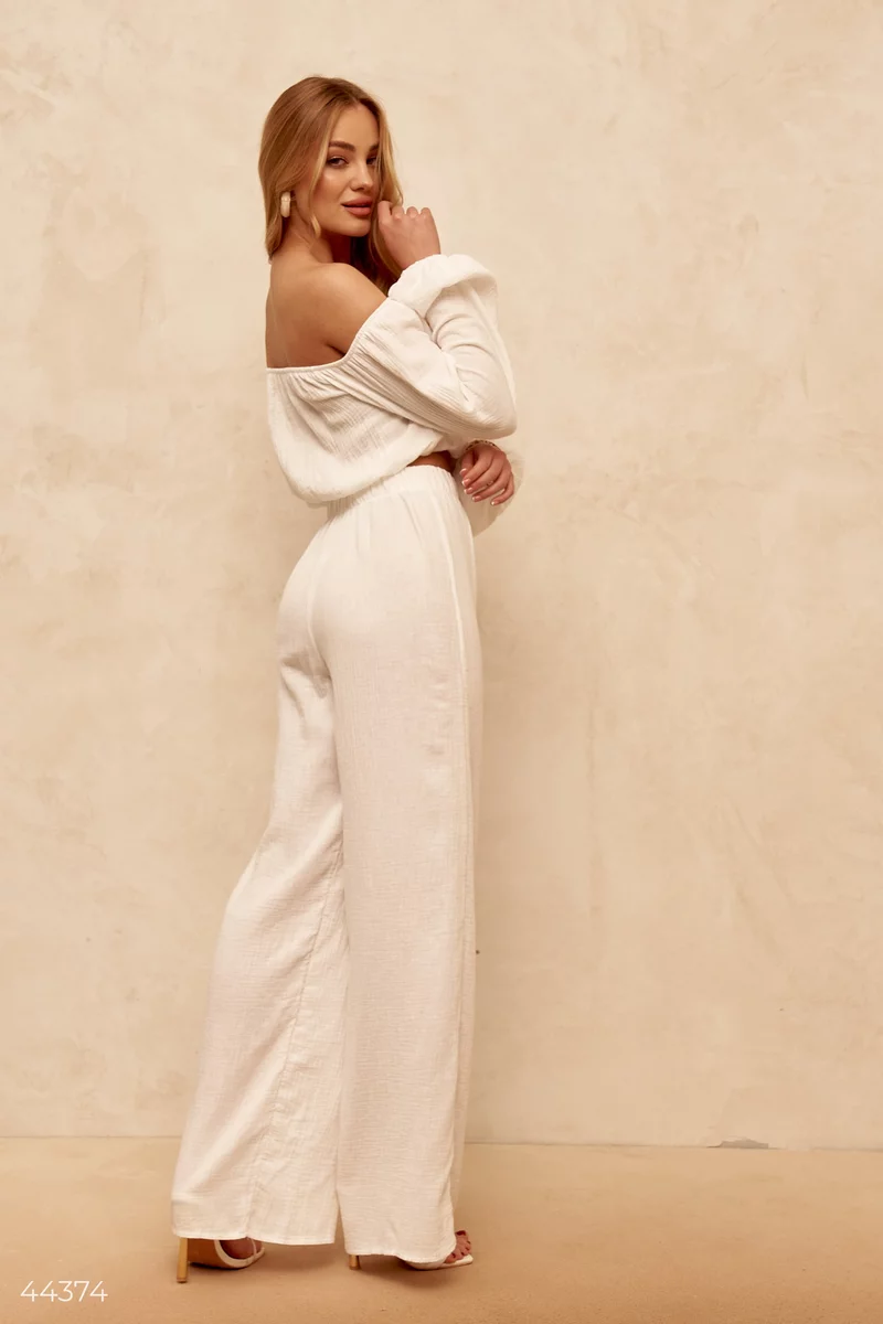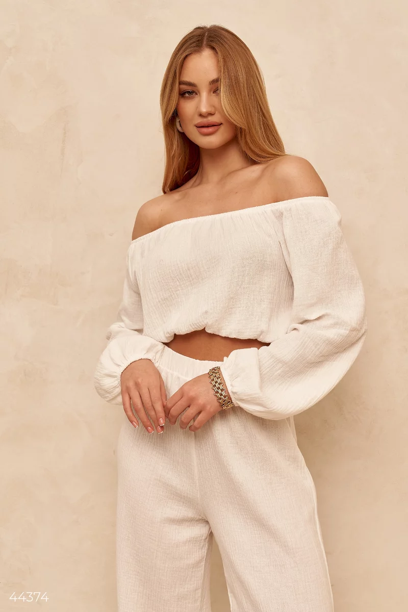 Літній комплект молочного відтінку, виготовлений із сумішевої бавовни. Укорочений топ із довгим пишним рукавом та вирізом-човник, який дозволяє відкрити лінію плечей. Комплект доповнюють високі штани вільного крою з еластичною вставкою на поясі. Доповніть модель плетеною сумкою та зручним взуттям на плоскій підошві.