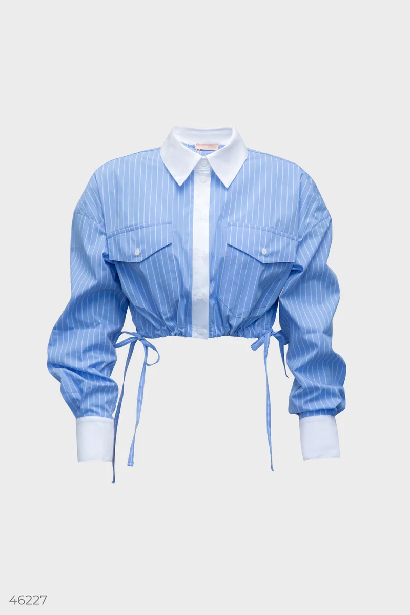 Комплект включає кроп-сорочку та спідницю міні. Сорочка з довгим рукавом, стилізована контрастною широкою білою манжетою та зав'язками, які дозволяють регулювати об'єм. Розкльошена спідниця з високою посадкою. Завдяки своїй універсальності, сорочку та спідницю можна носити як у комплекті, так і окремо. Кроп-сорочка легко поєднується зі штанами, джинсами, шортами чи спідницею з високою талією. Образ зі спідницею можна доповнити лонгслівом, футболкою чи топом на бретелях.