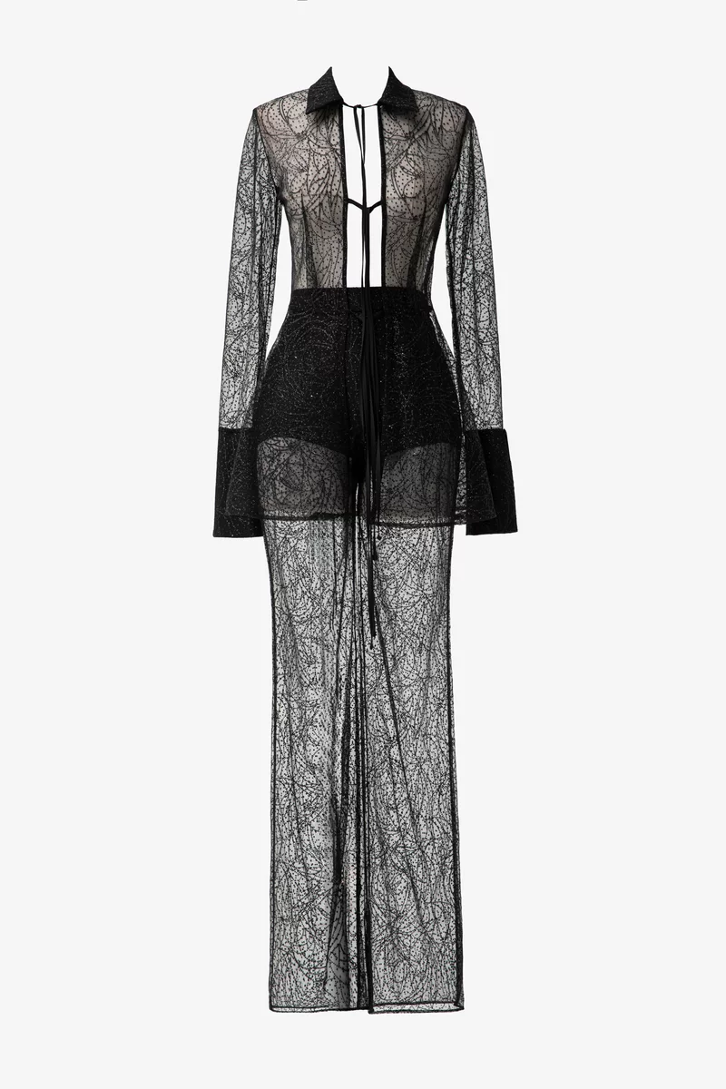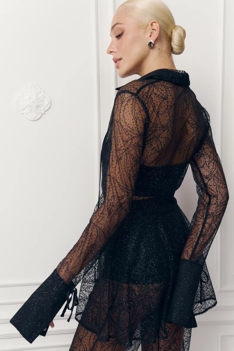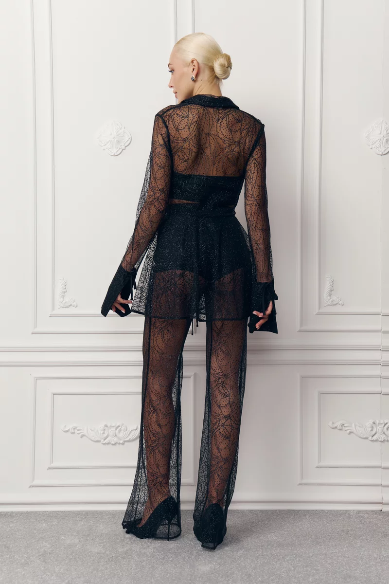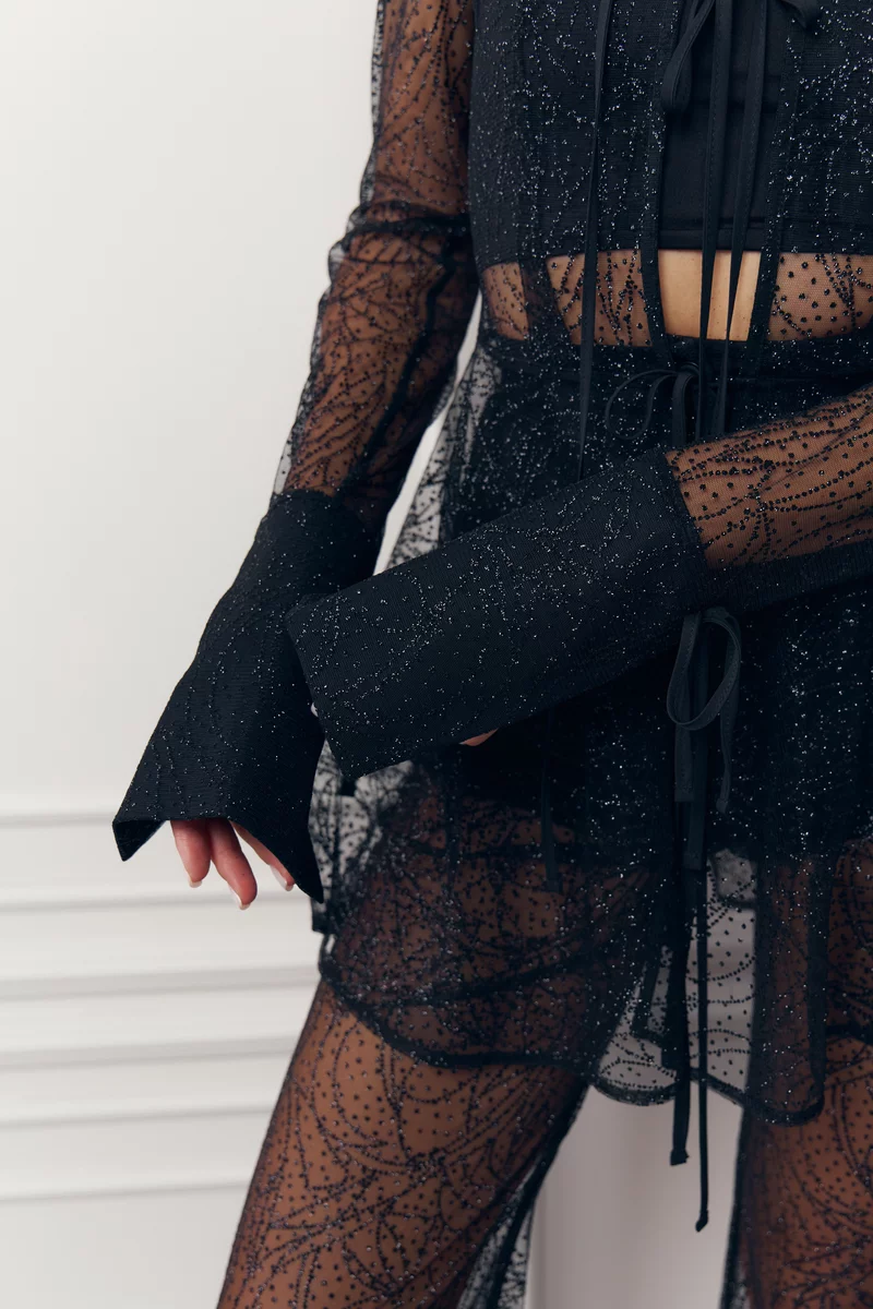 Комплект із блузи та штанів з мерехтливим декором. Блуза прямого вільного крою на зав'язках. Штани із високою талією, на підкладці. Застібаються на приховану блискавку ззаду