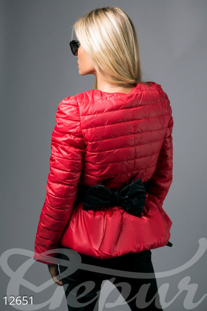 Короткая стеганная куртка с горизонтальной строчкой слегка расширенная внизу. С длинным рукавом, впереди застегивается на молнию. В комплекте идет широкий черный пояс на резинке с массивным бантом, который можно расположить как спереди, так и сзади. Благодаря своей необычной форме будет хорошо смотреться с вещами в спортивном и классическом стиле.