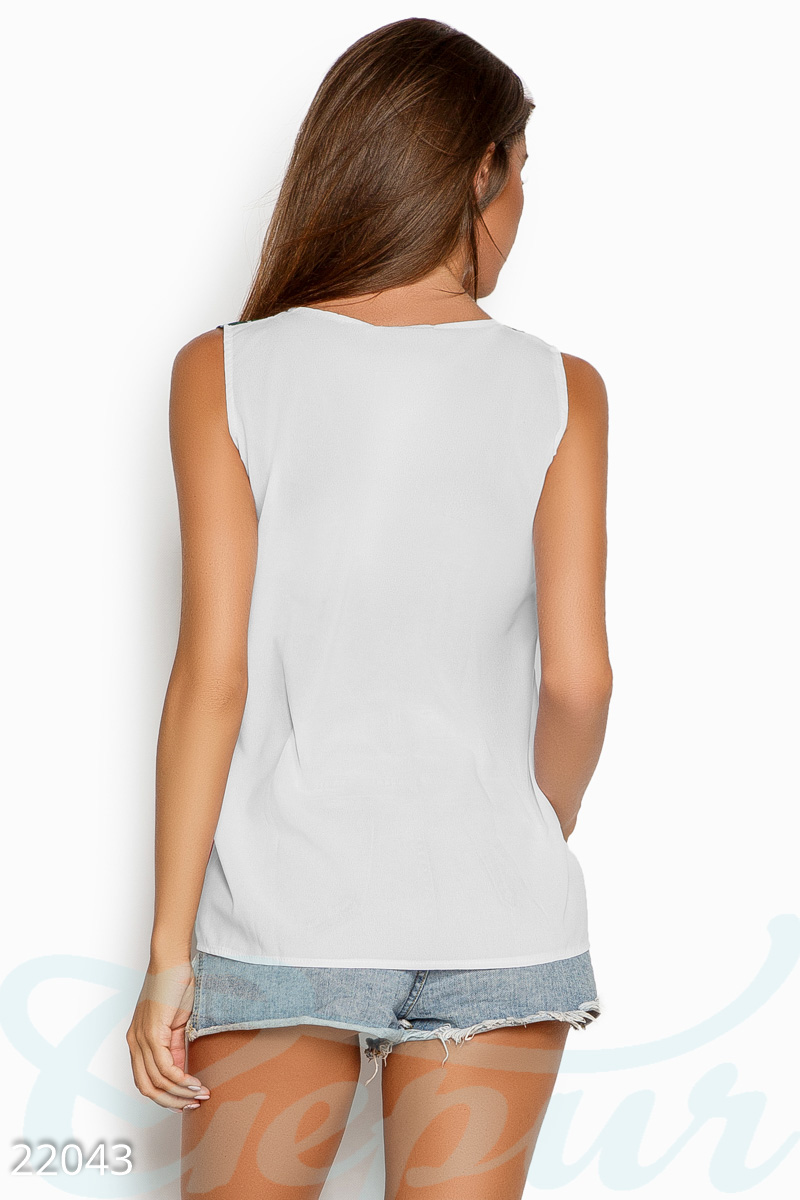 Летний топ с классическим круглым вырезом и ярким принтом "Фрукты", выполненная из тонкого шифона в форме трапеции.