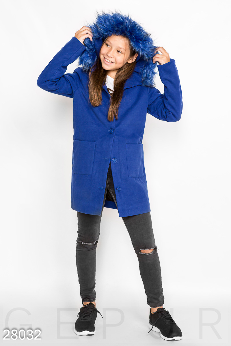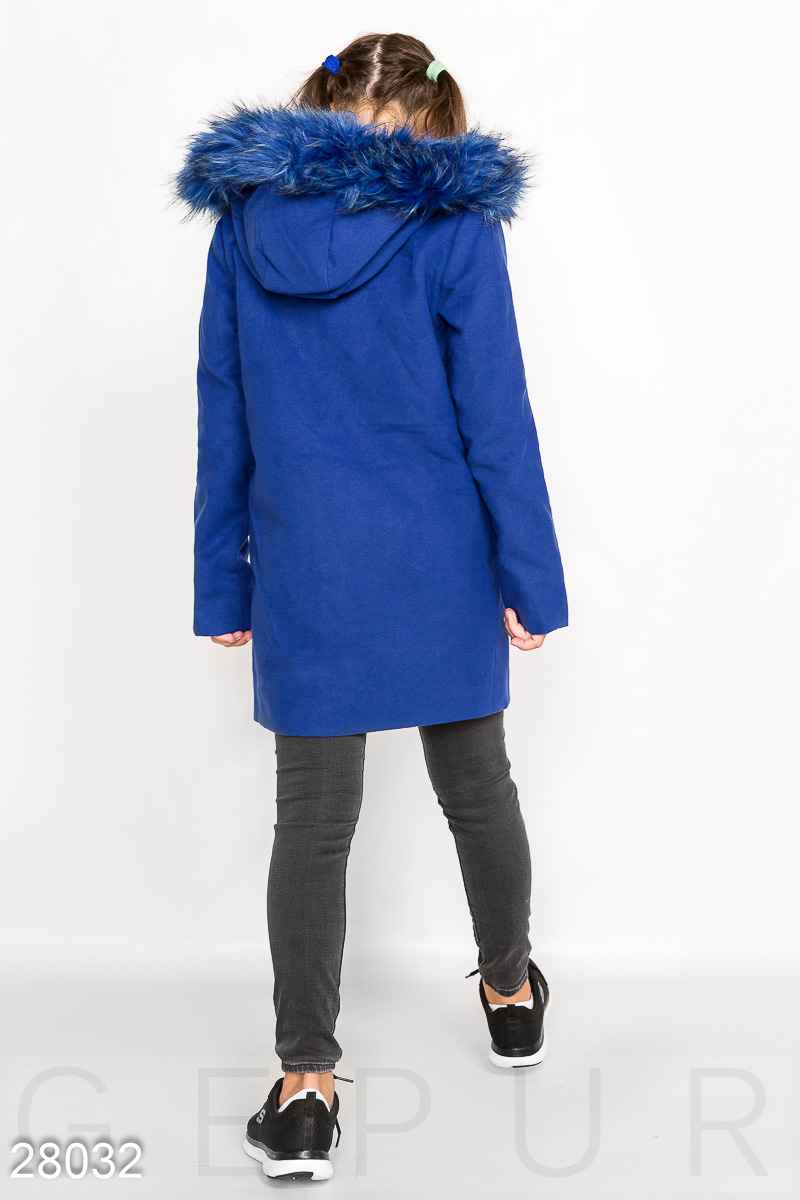 Утепленное кашемировое пальто с двумя накладными карманами и капюшоном, дополненным эко-мехом.