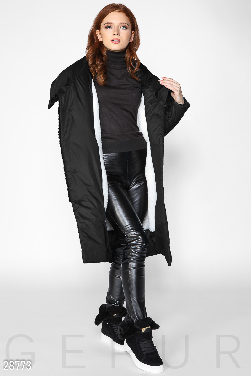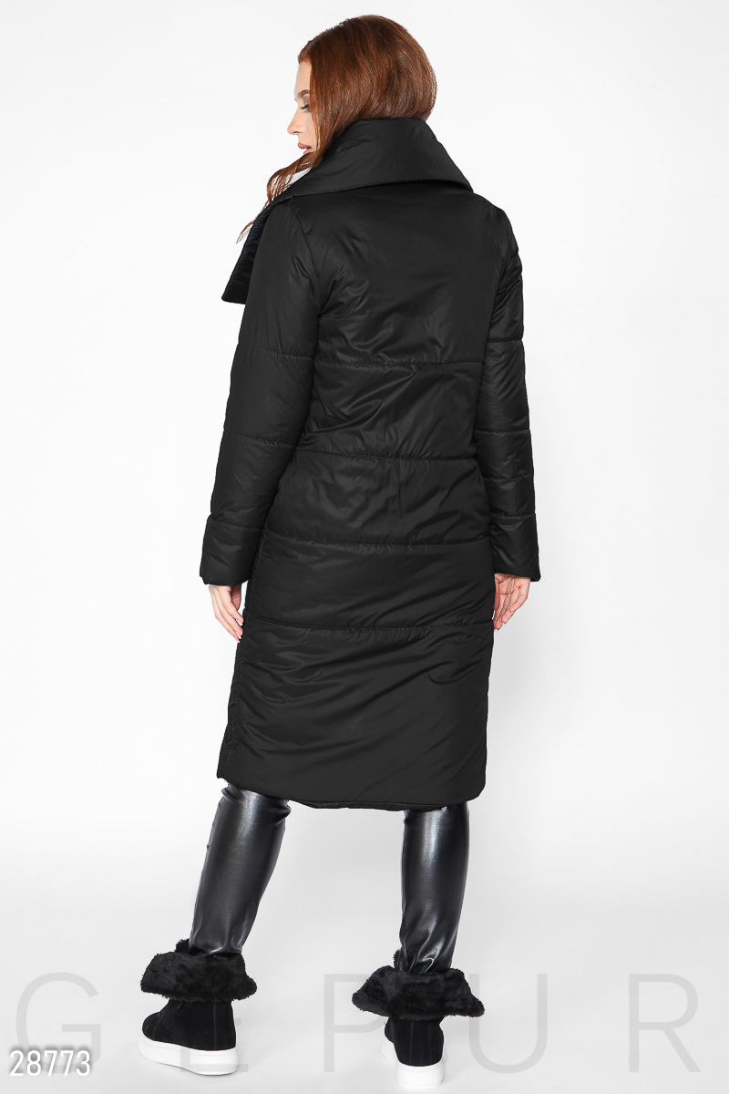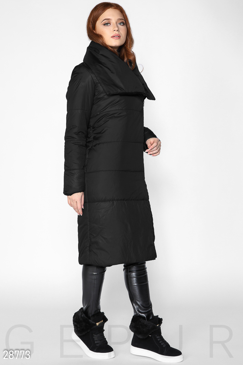 Комфортное зимнее пальто из плащевой ткани: объемный шалевый воротник с застежкой на молнию, два небольших кармана в швах и асимметричная застежка спереди.