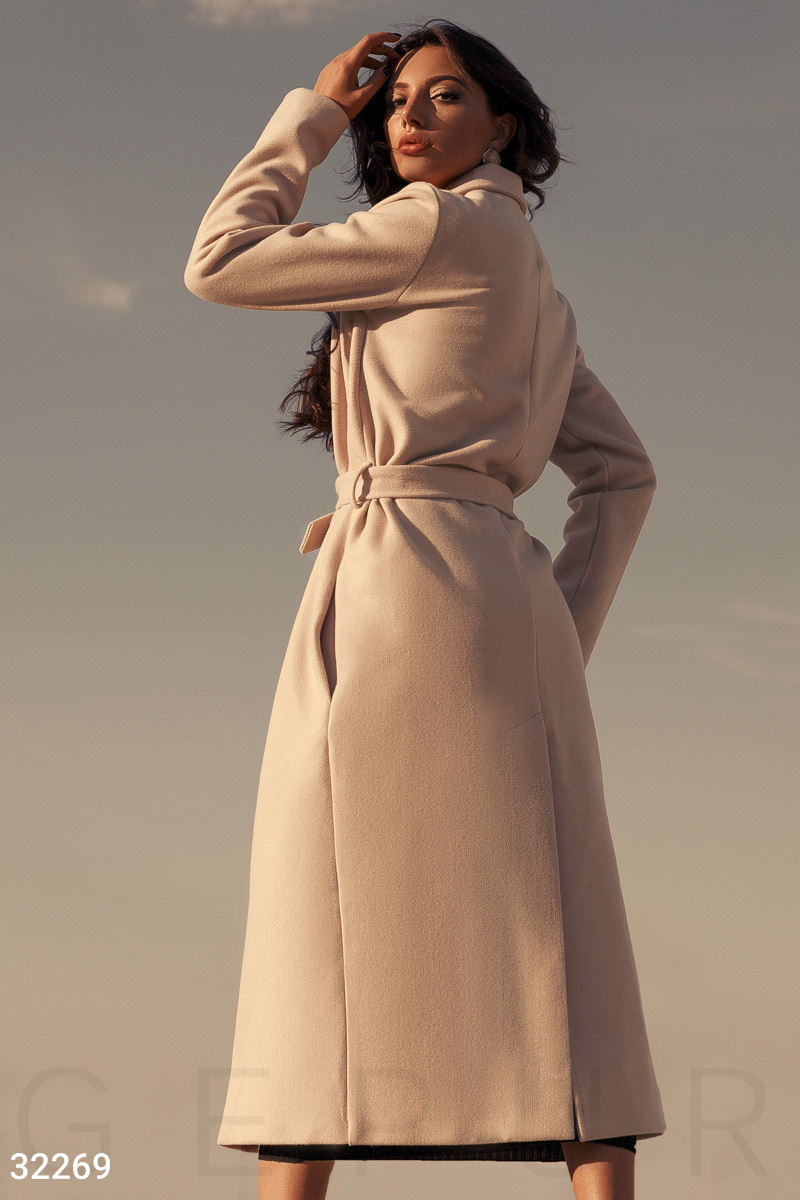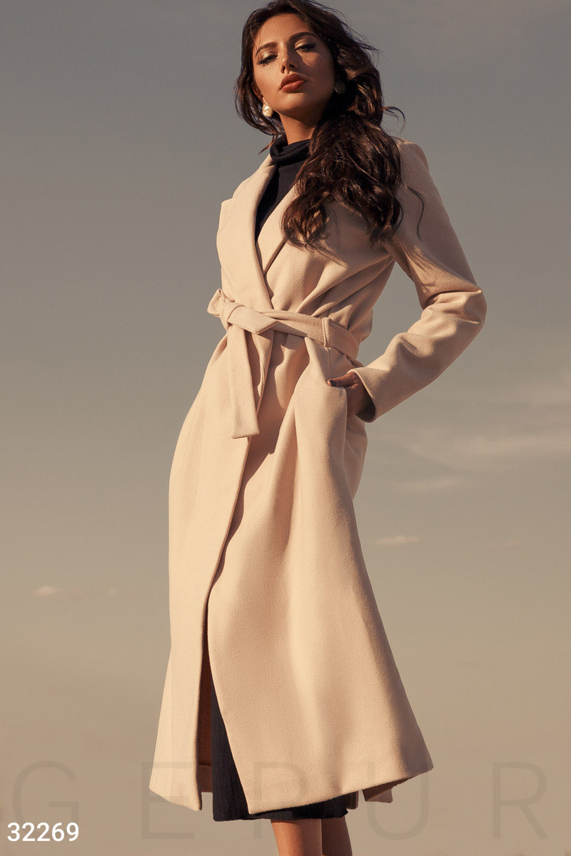 Трендовое кашемировое пальто свободного кроя с классическим отложным воротником, лацканами, поясом в петлях, карманами в швах и небольшим разрезом сзади.