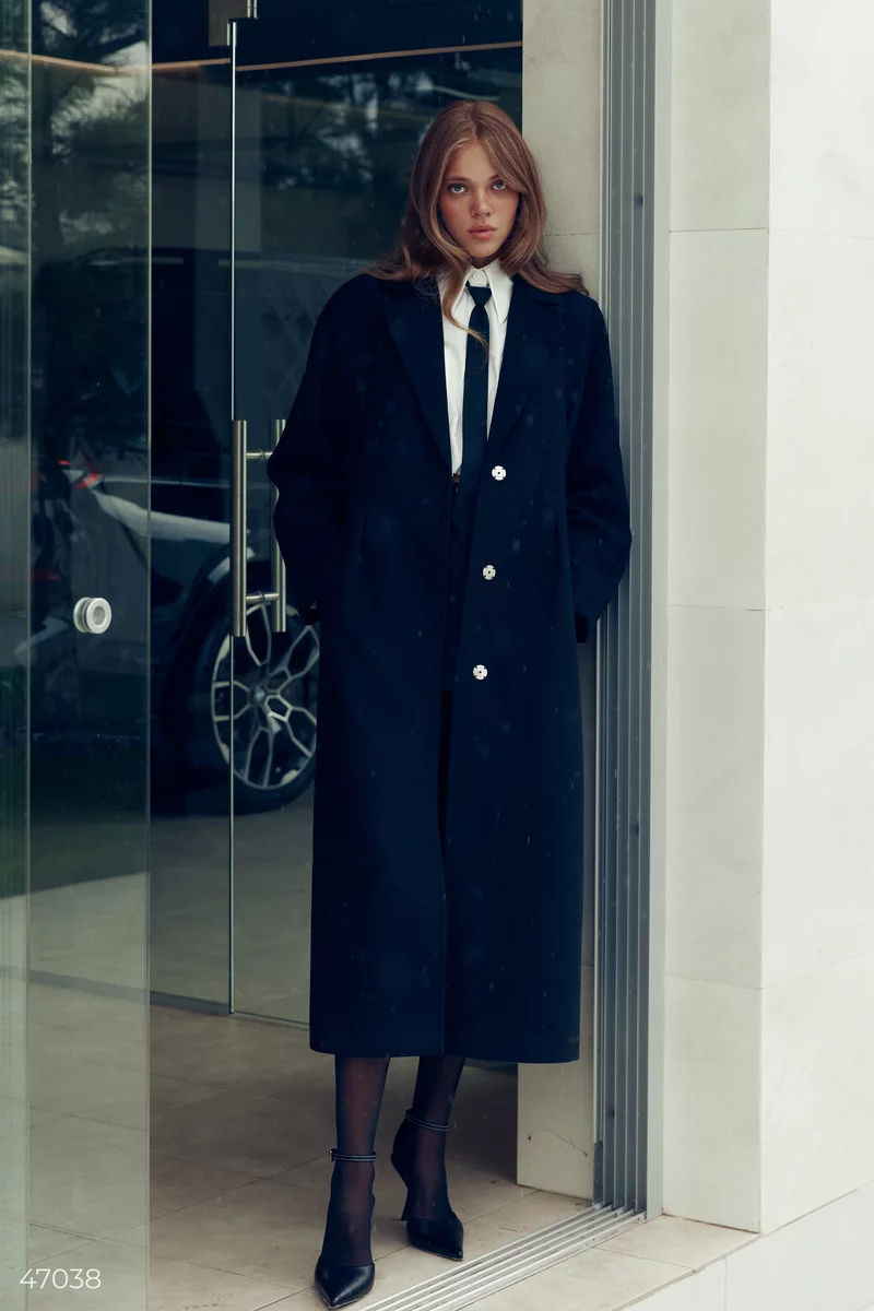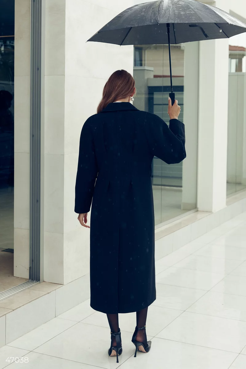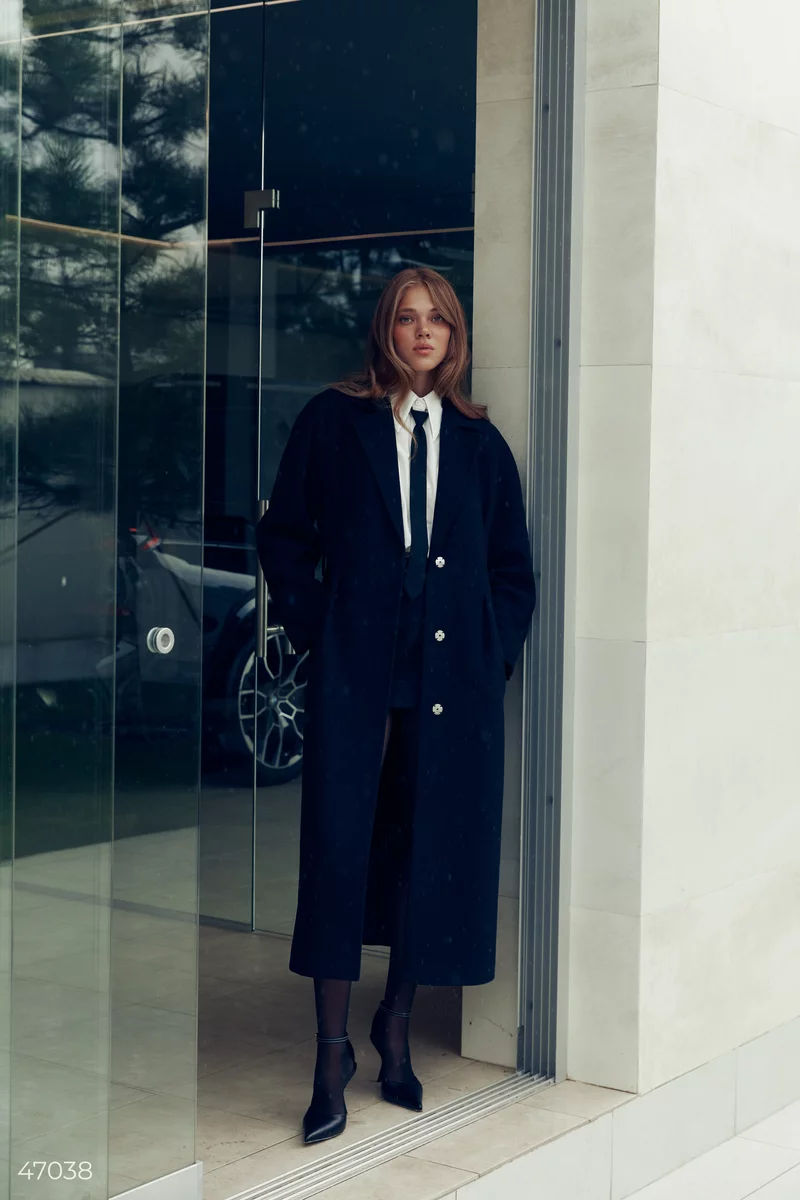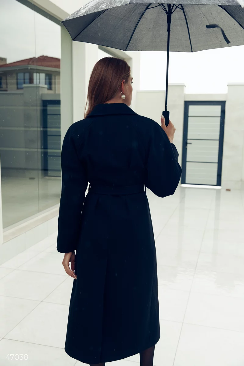 Базове довге пальто прямого крою. Відкладний комір з лацканами, бічні прорізні кишені та знімний пояс-стрічка, що підкреслює лінію талії. Пальто застібається на приховані кнопки. На підкладці