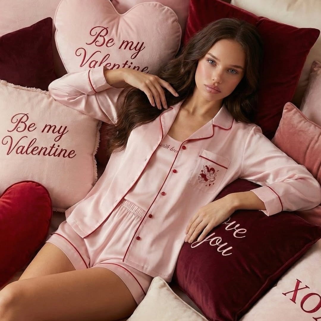 Піжамний комплект зі штучного шовку складається із трьох елементів: топа на бретелях, коротких шортів та блузи з ангелочком на кишені. Із таким комплектом можна створити безліч затишних домашніх образів