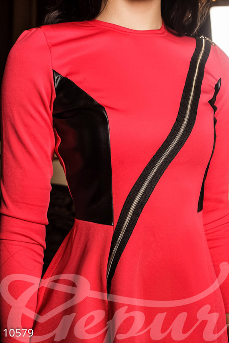 Платье а-силуэта, рукав 3/4, комбинированное по цвету, декорированное золотой змейкой накосую, с кожаными боковыми поясными вставками и по низу юбки. Материал: дайвинг Длина: 84см Цвет:красный, вставки - черный
