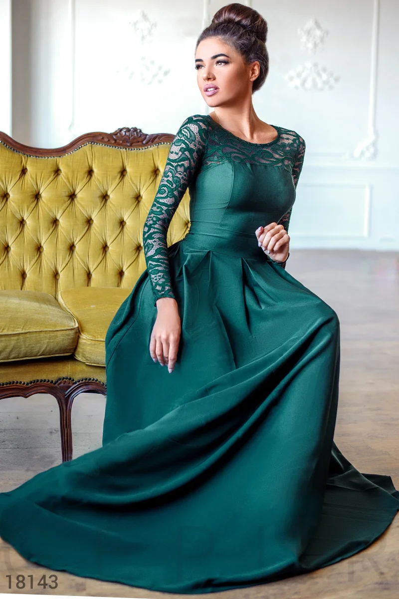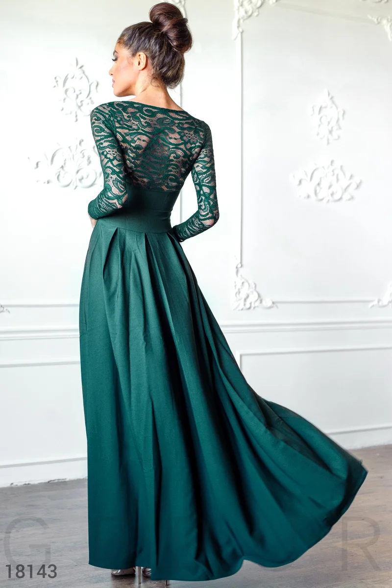 Эффектное вечернее платье, выполненное из струящейся ткани: прозрачная гипюровая кокетка и рукав, лиф-бандо, широкий втачной пояс и длинная расклешенная юбка с мягкими складками.