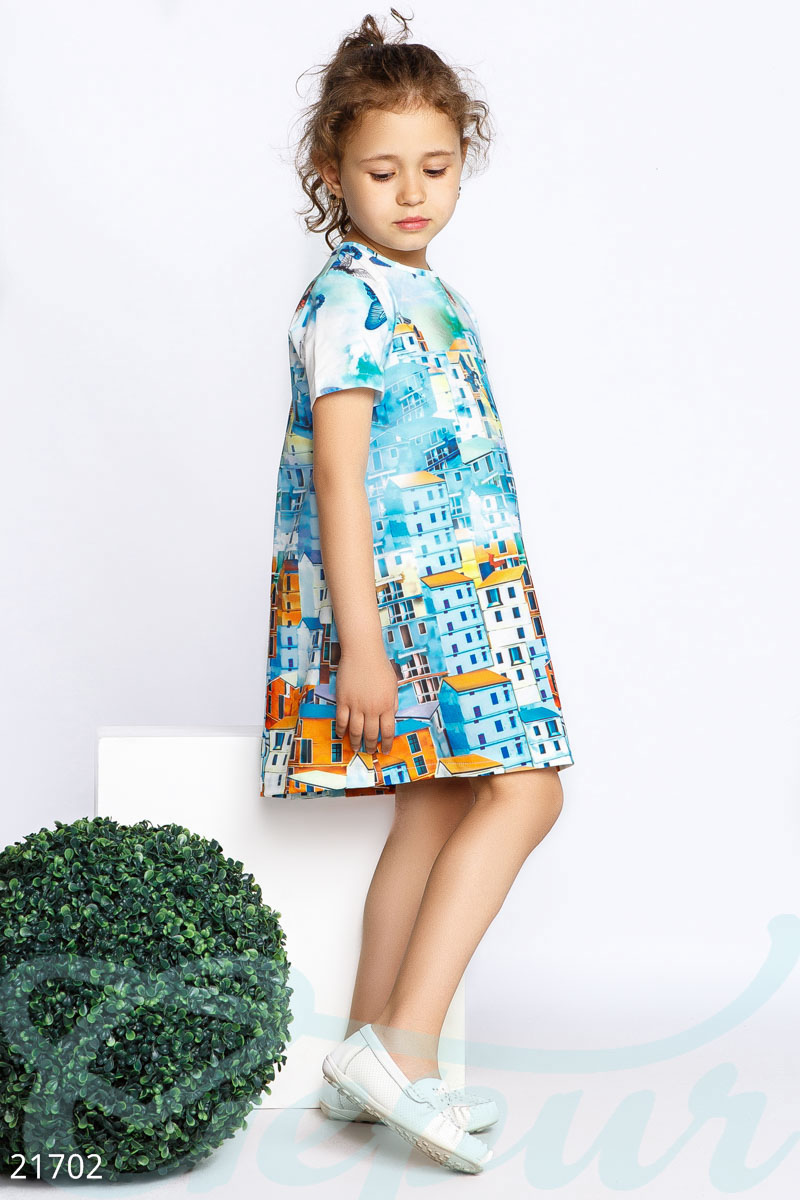Летнее платье-трапеция с коротким рукавом, выполненное из легкой ткани с цветным принтом.