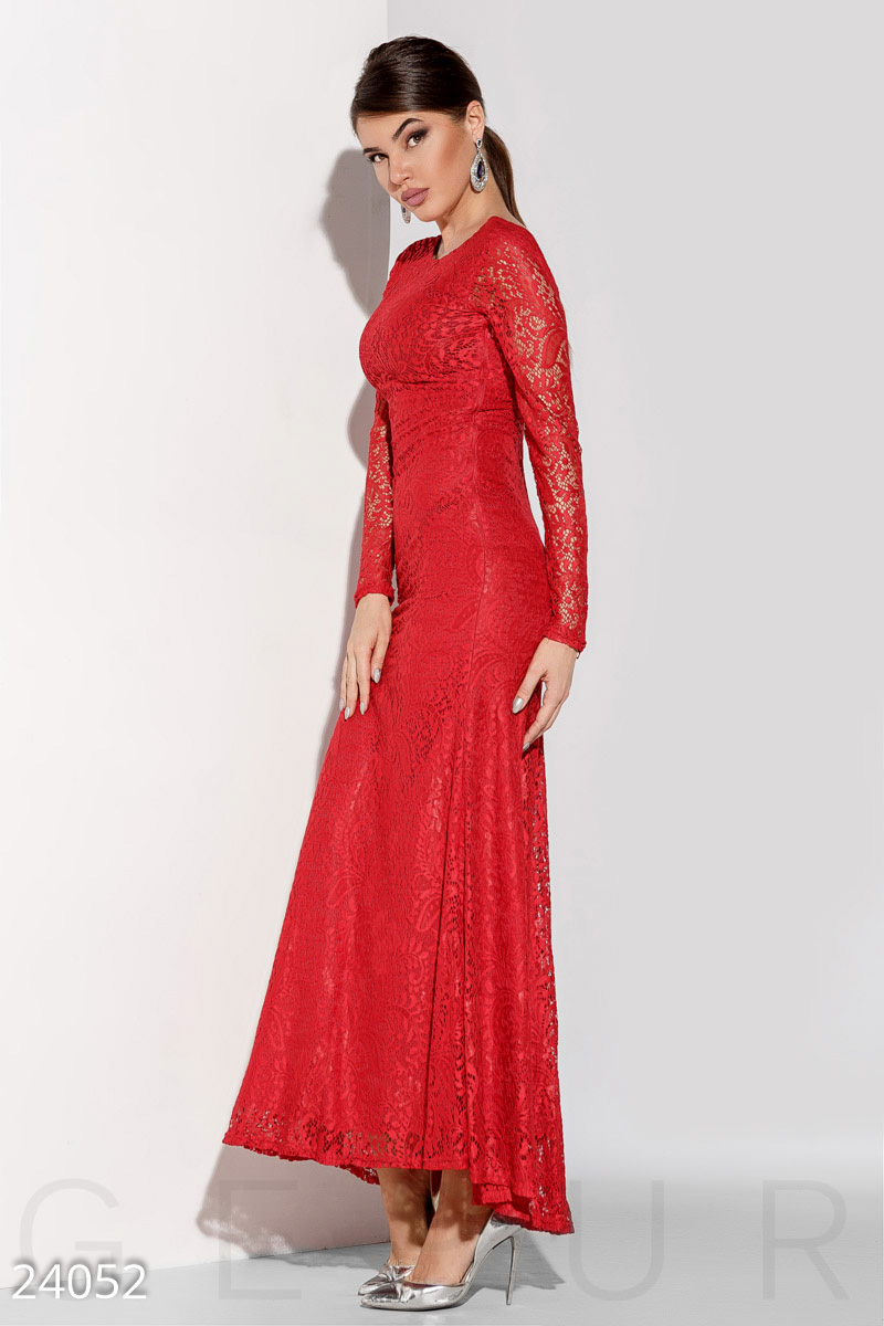 Яркое вечернее платье-годе из мягкого кружева на основе из микромасла, дополненное глубоким вырезом на спинке.