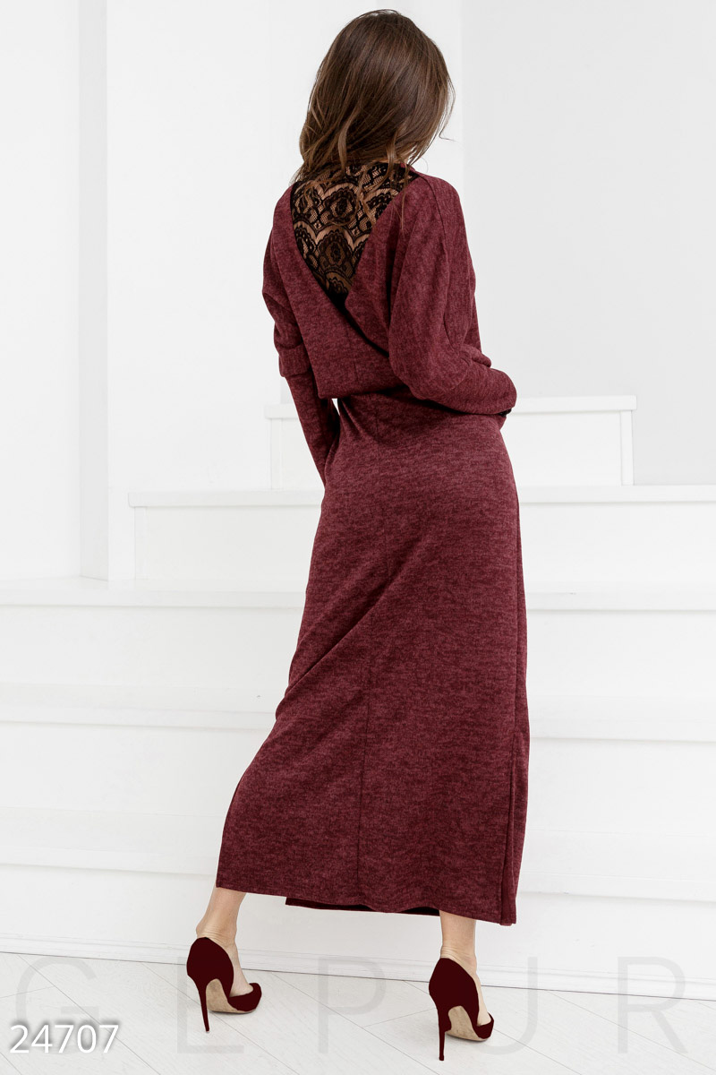Универсальное трикотажное платье с длинной юбкой, двумя прорезными карманами, втачным поясом с завязками на кулиске, кружевной вставкой на спинке и съемной подвеской.