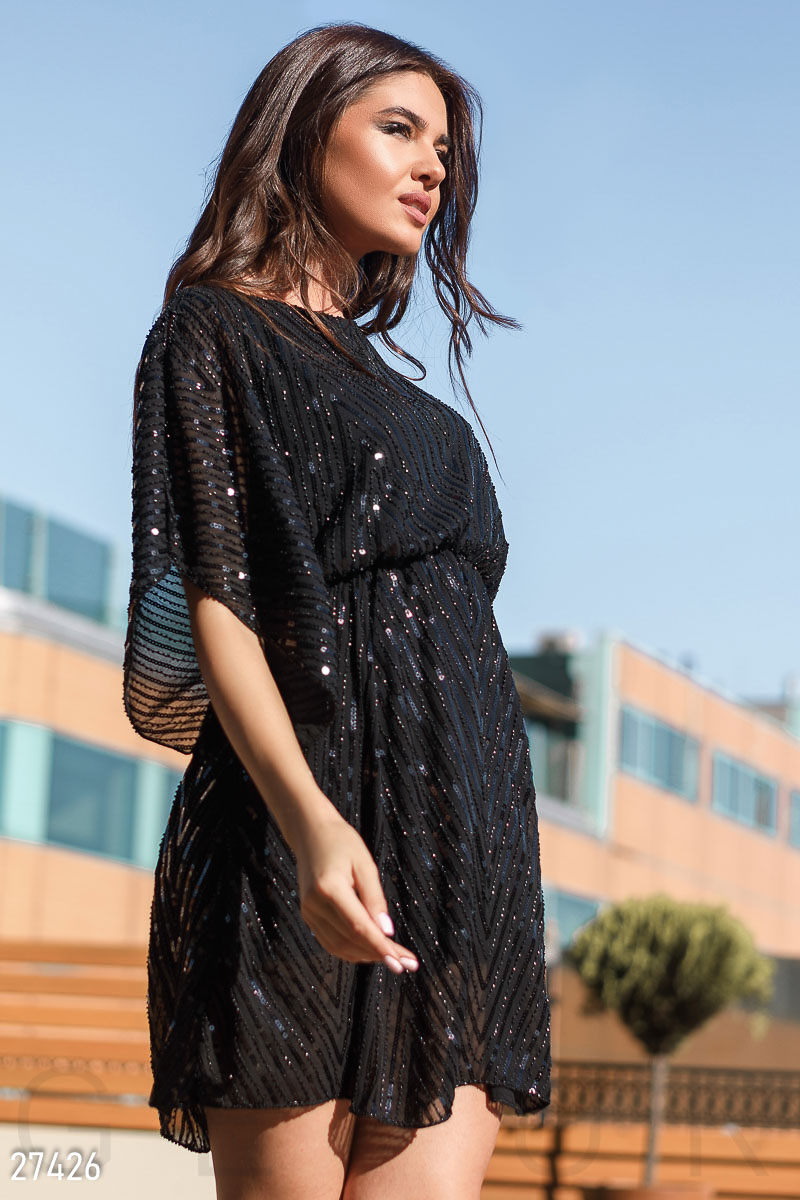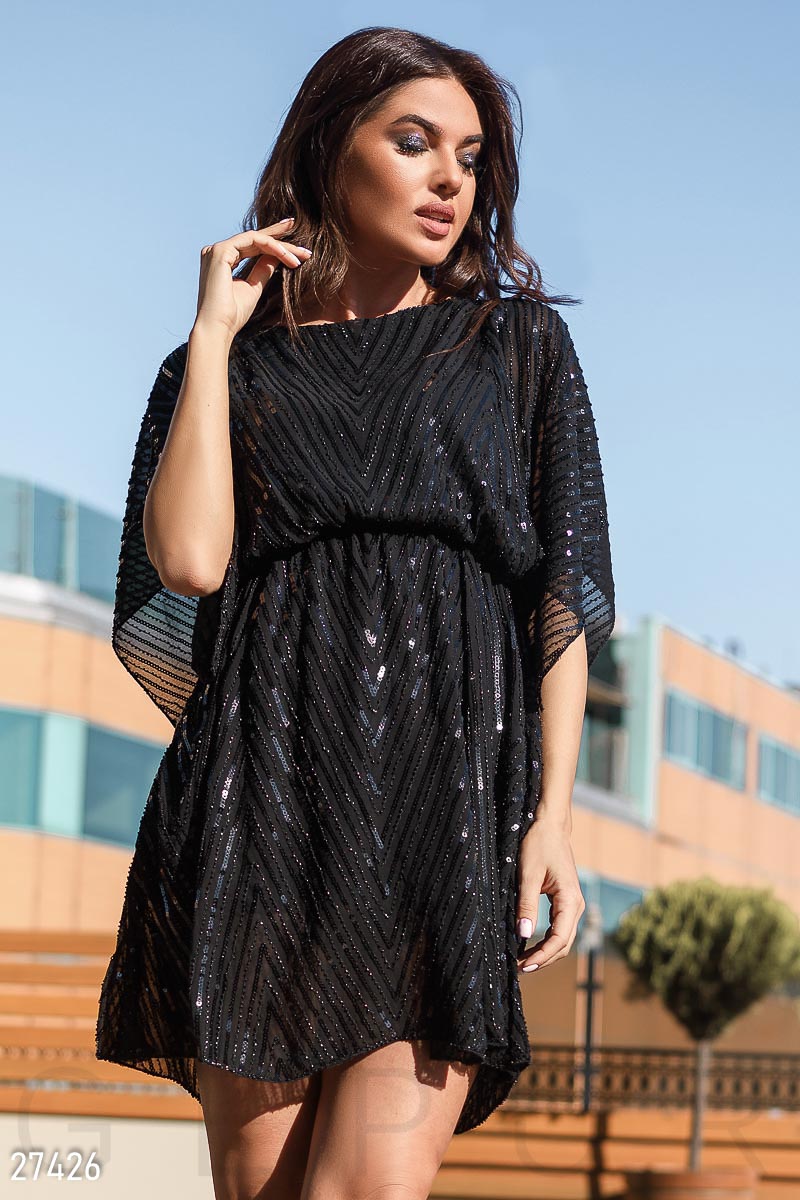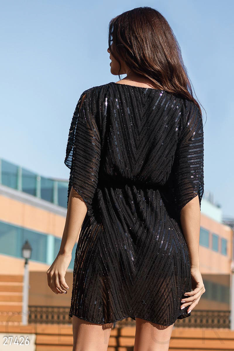 Декорированное вечернее платье с широкими рукавами-кимоно и разрезами на плечах, выполнено из сетки и расшито бисером и пайетками: округлый вырез воротника и свободная кокетка; на поясе присутствует эластичная вставка. .