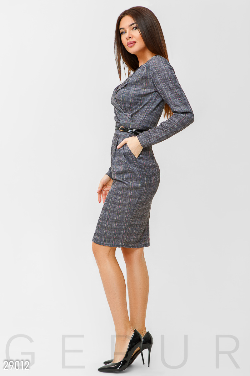 Элегантное платье облегающего кроя, выполненное из легкого трикотажа в клетку: небольшой v-образный вырез спереди, аккуратные лацканы, длинный рукав с узкой манжетой, втачной пояс и юбка-миди с двумя карманами по бокам и небольшим разрезом сзади.