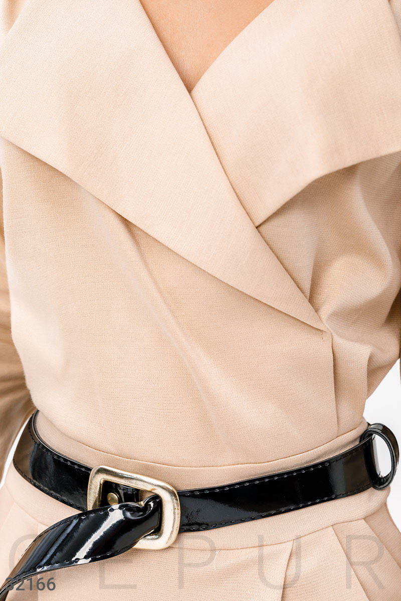 Облегающее трикотажное платье бежевого цвета с глубоким v-образным вырезом, лацканами, длинным рукавом, юбкой с защипами и небольшим разрезом сзади, дополненная съемным ремнем из эко-кожи.