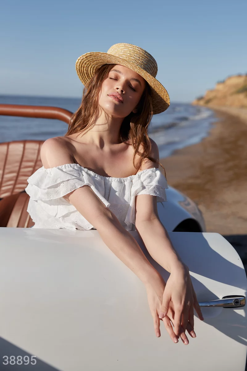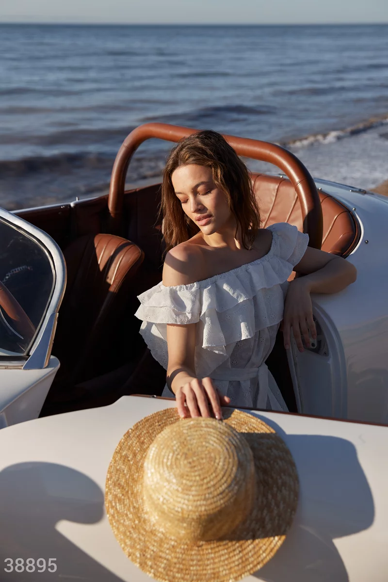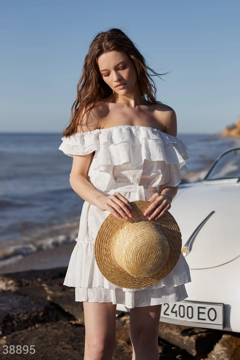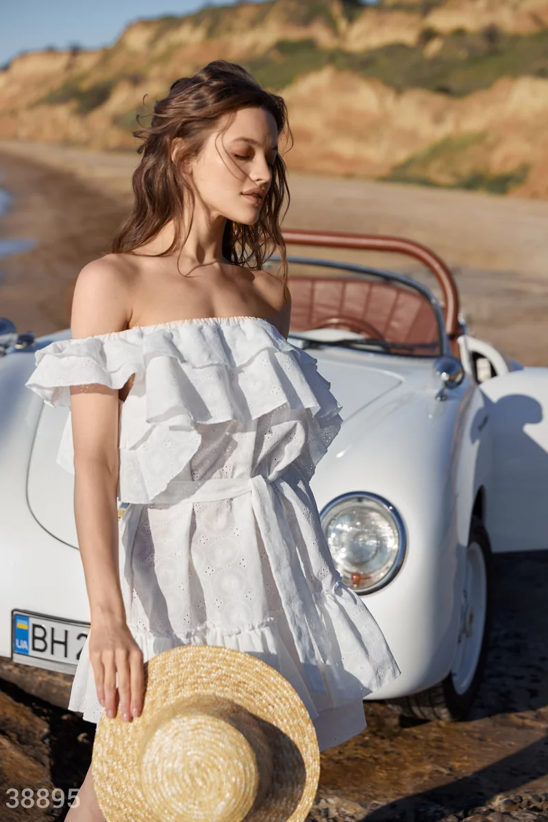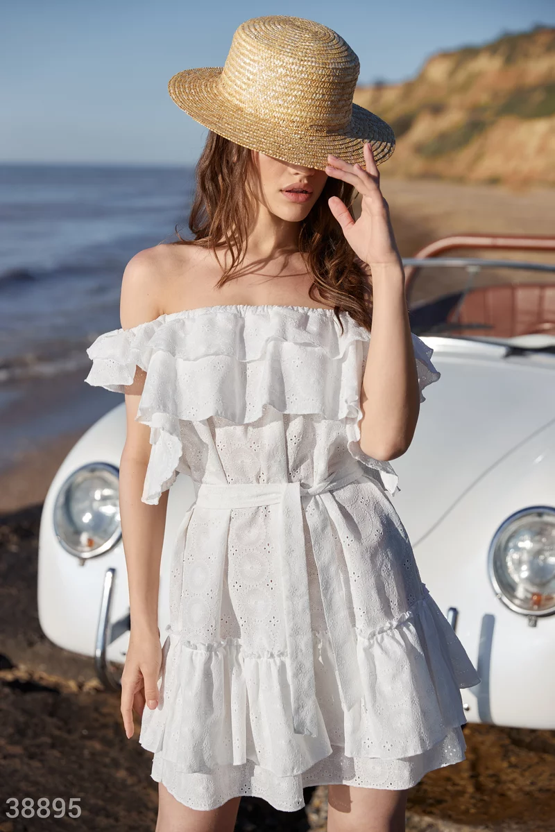 Коротка біла сукня неминуче зверне на себе увагу. На це працюють матеріал з ажурною вишивкою, широкі волани на подолі та зоні декольте. Зробити силует приталеним дозволяє пояс-стрічка.