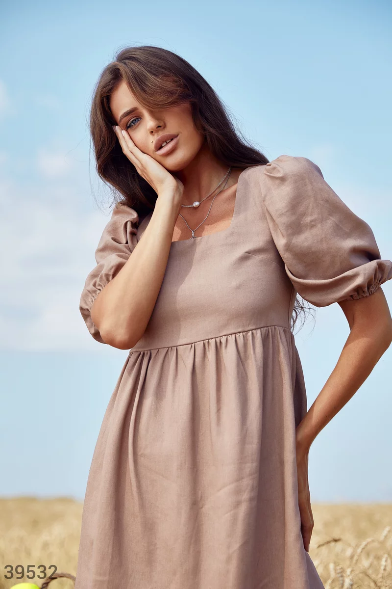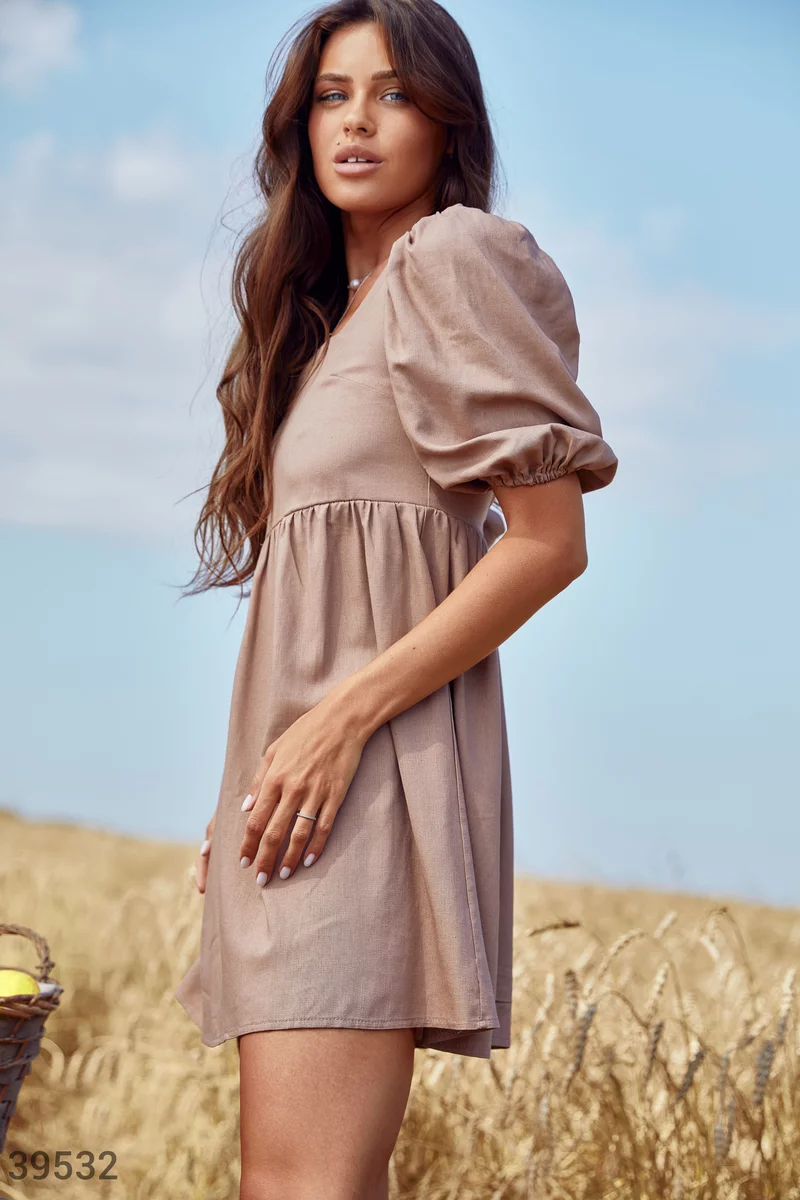 Коротка сукня із завищеною лінією талії, виготовлена з м'якої лляної тканини. Відкрита спинка доповнена еластичною шнурівкою. Ефектний пишний рукав з еластичною манжетою та акуратний квадратний виріз на грудях. Сукня ідеальна підійде для повсякденних образів у спекотний сезон.