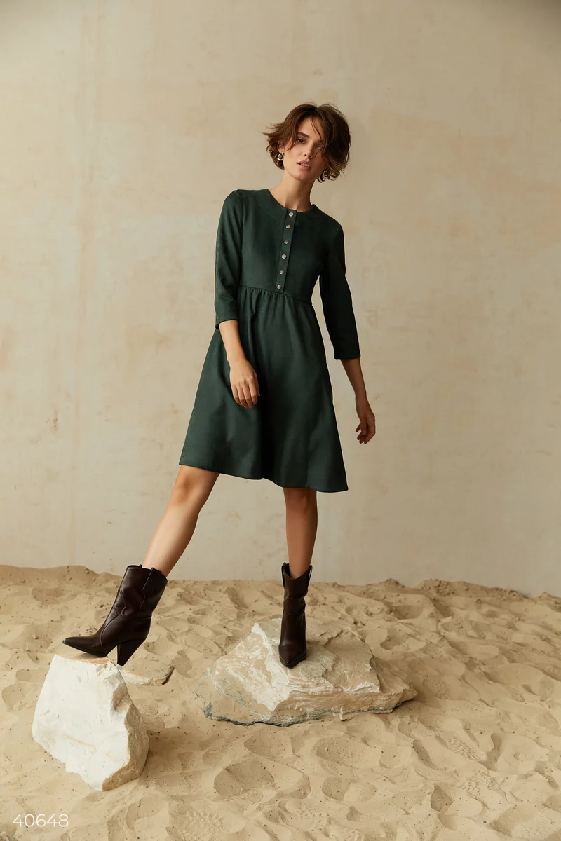 Сукня-міді смарагдового кольору із замші – знахідка для тих, хто любить створювати свято у будній день. Глибокий колір додасть образу романтичності, а замша дозволить заграти по-новому. Модель додатково стилізована гудзиками на грудях.