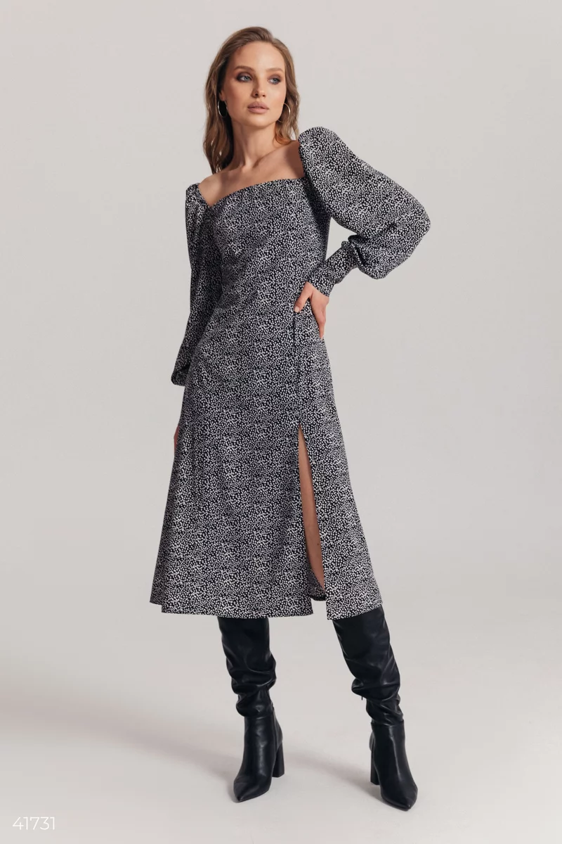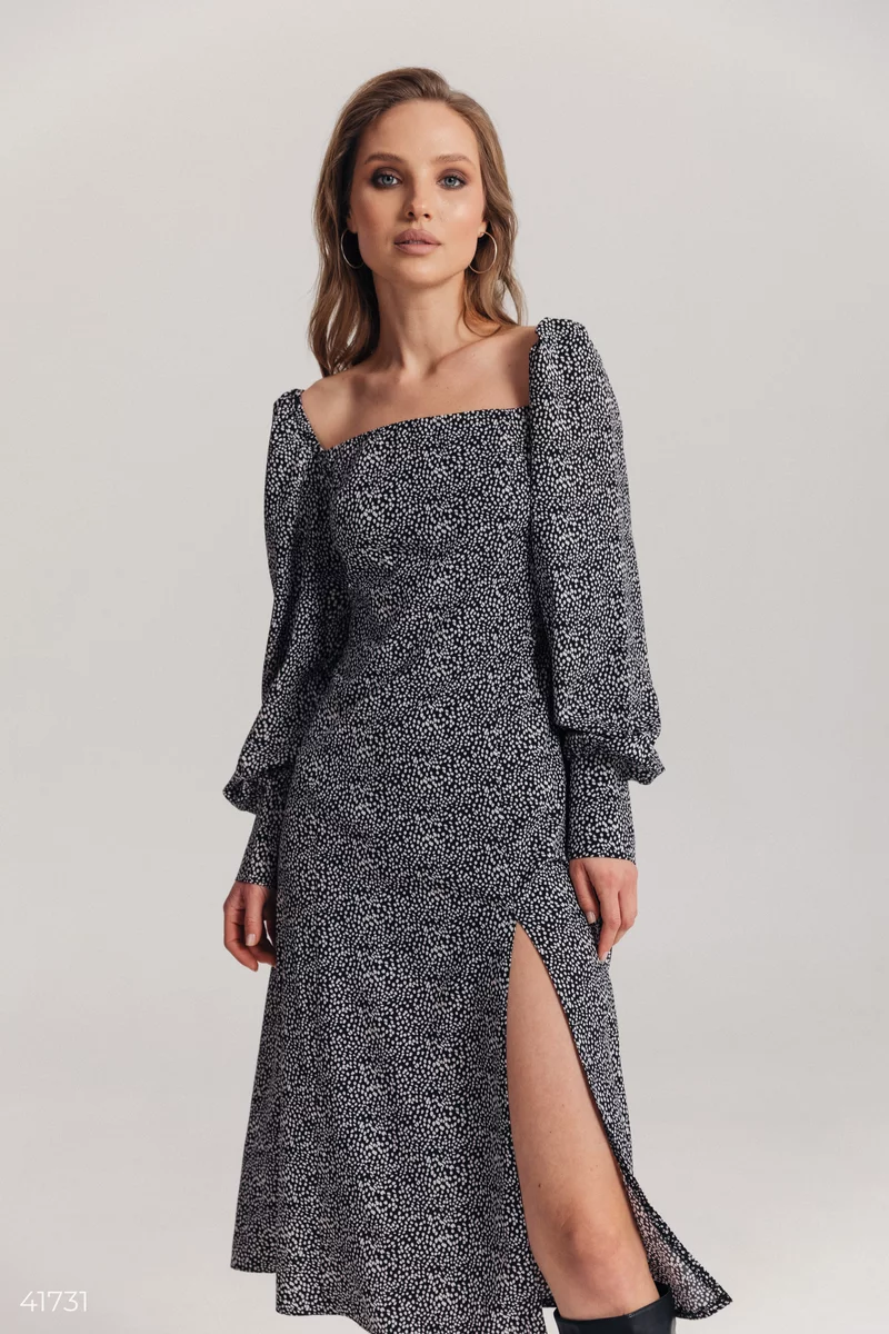 Чорне плаття в горошок з розрізом