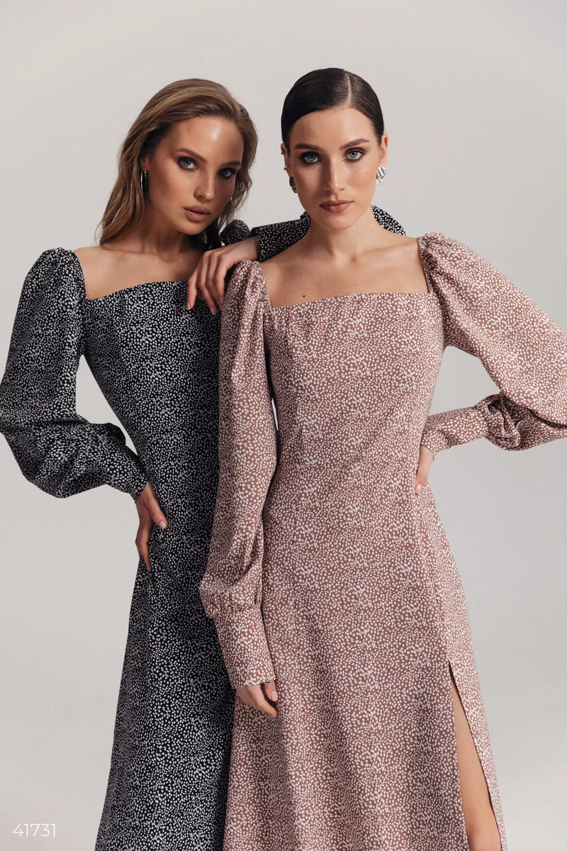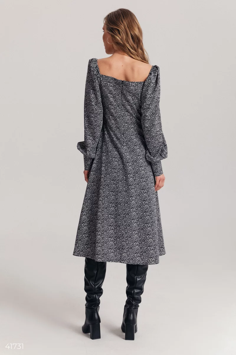 Чорне плаття міді в горошок виготовлене з легкої тканини софт. Модель з пишними рукавами з еластичною вставкою у плечах, що дозволяє фіксувати комфортну посадку. Збоку сукня прикрашає розріз, що відкриває довжину ніг. Створіть стильний образ у поєднанні з високими чоботами чи трендовими черевиками-козаками.