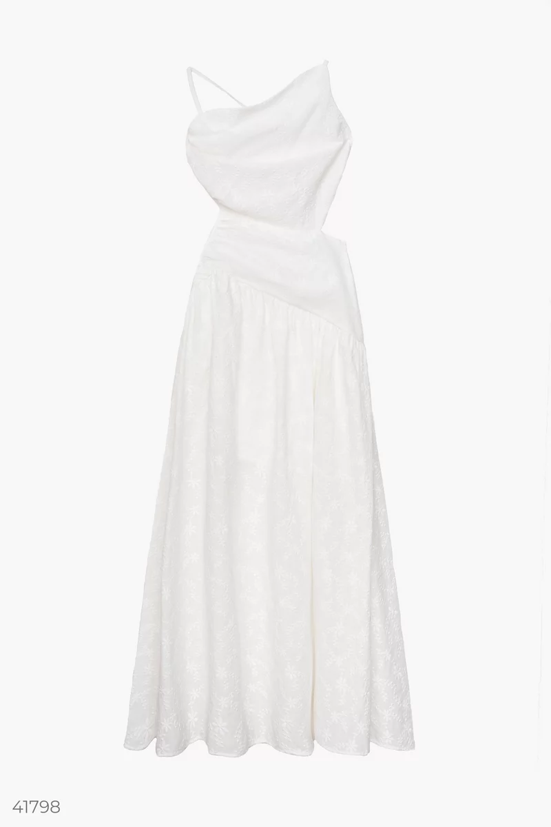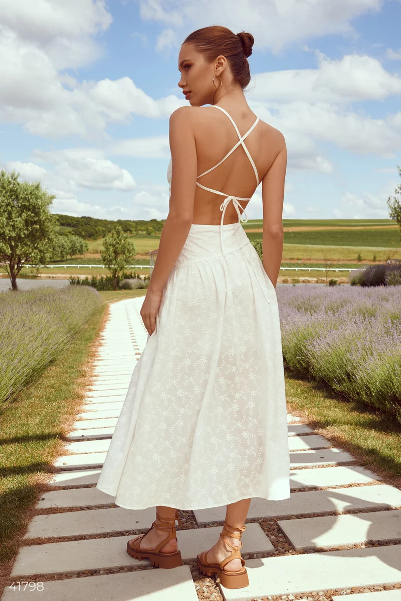 Сукня в молочному відтінку з натуральної бавовни. Доповнена спідницею і шнурівкою на тонких бретелях. Асиметрія, фігурні вирізи та відкрита спинка - тренд SS'22. На прогулянку або побачення стилізуйте з босоніжками на зав'язках та невеликою сумкою хобо.