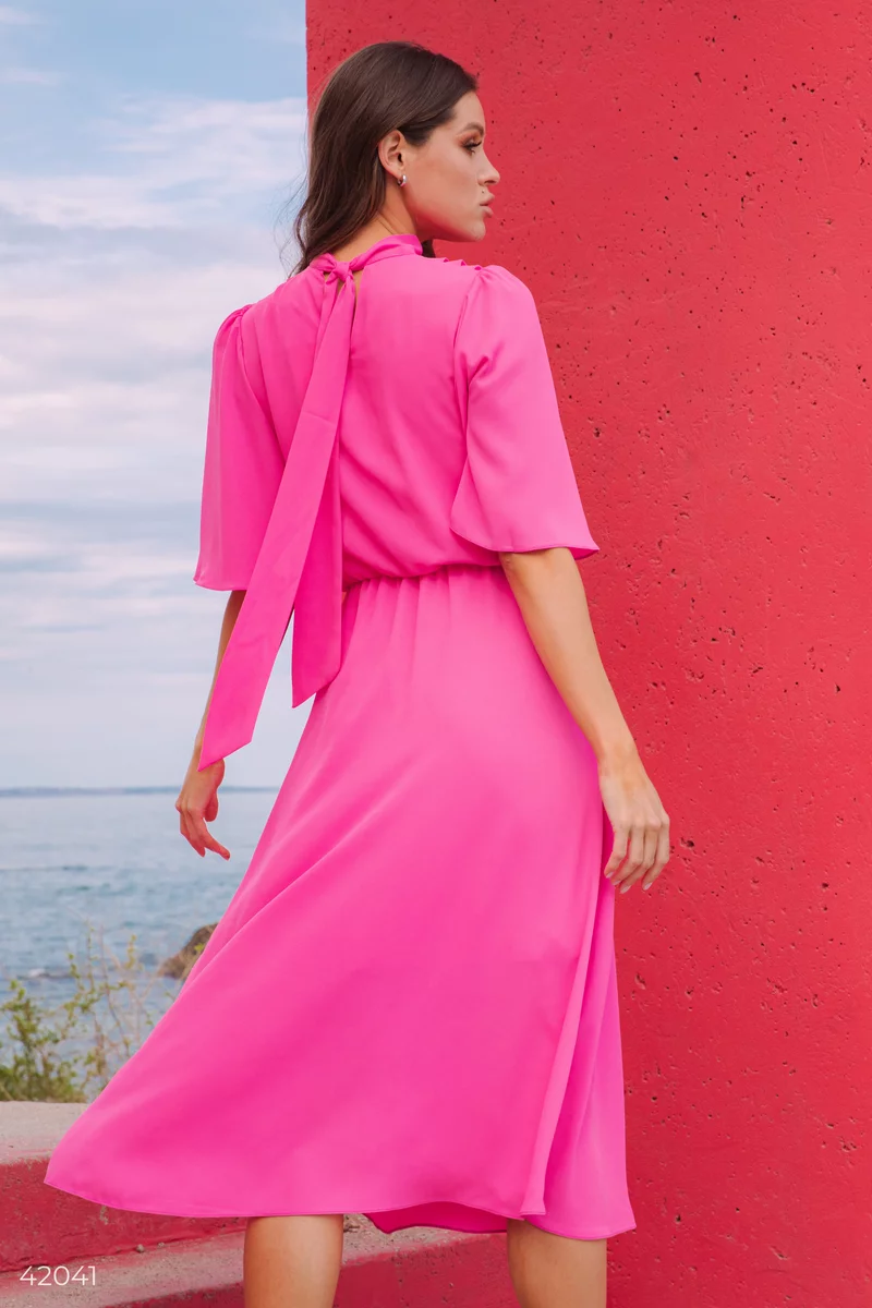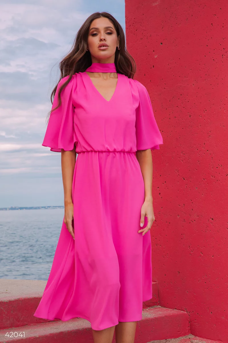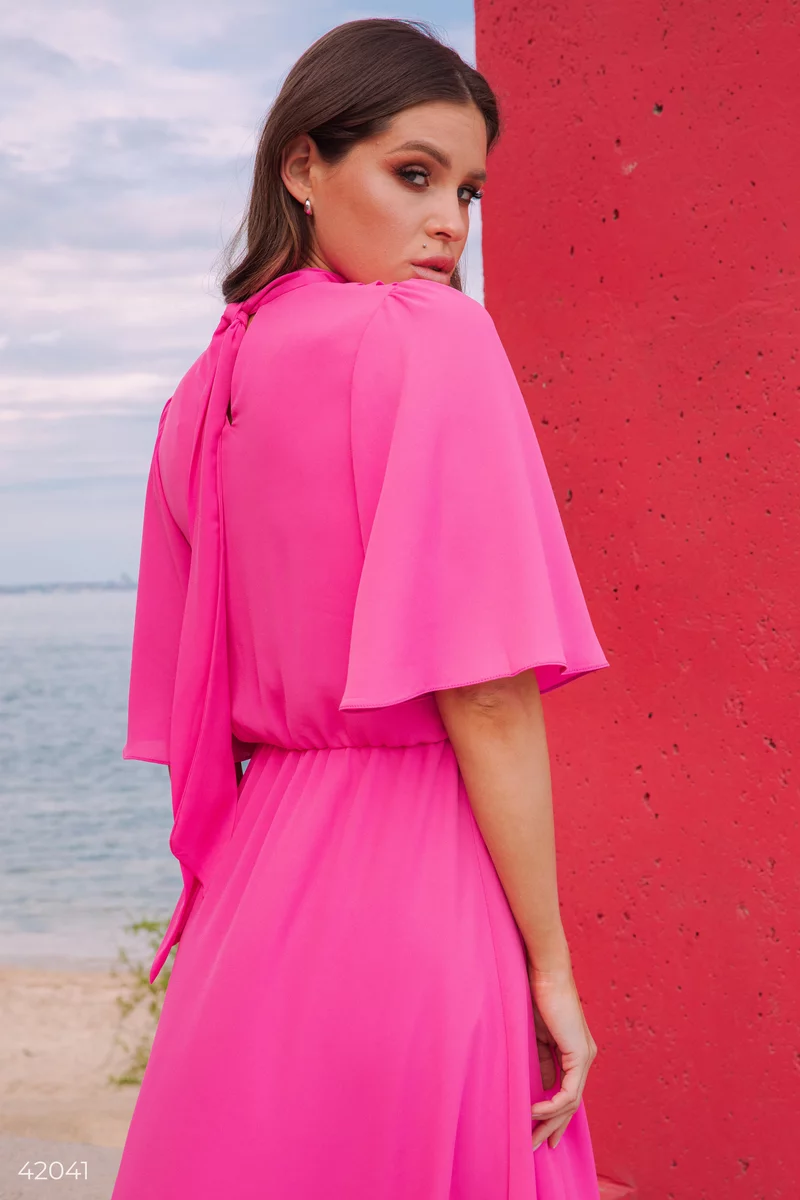 Ефектна літня сукня розкльошеного кроя, виконана з фактурної шифонової тканини. Суворий v-подібний виріз спереду і на спинці, комір-чокер з зав'язками, об'ємні рукави-крилки, защипи на плечах і довга спідниця, доповнена на талії еластичною вставкою.