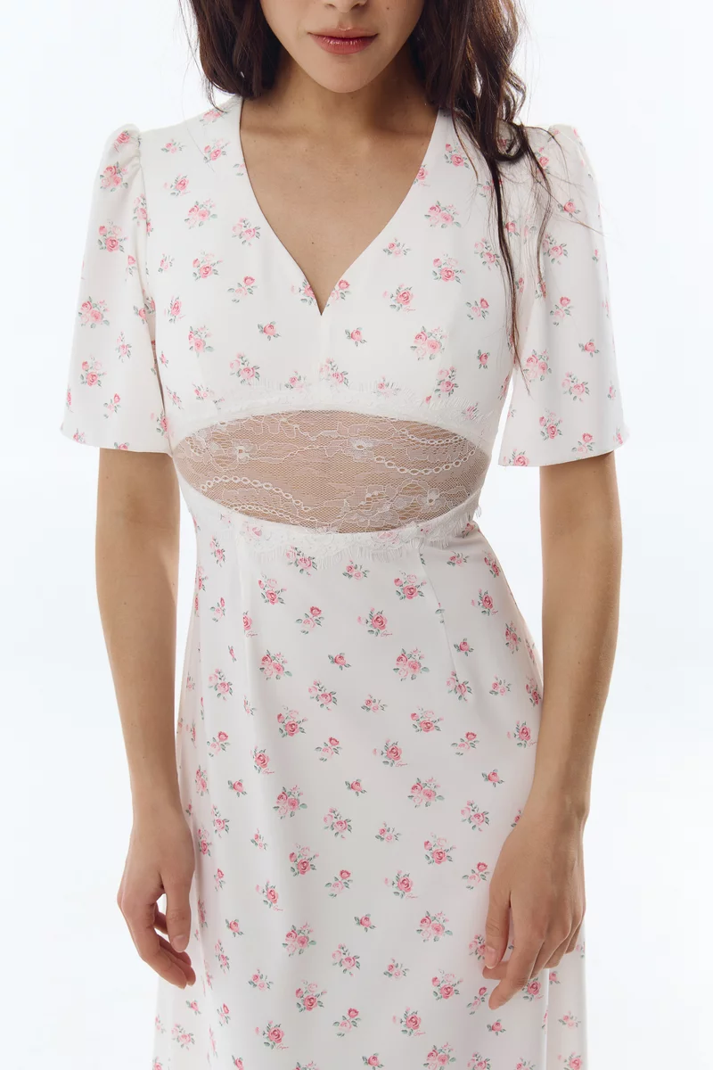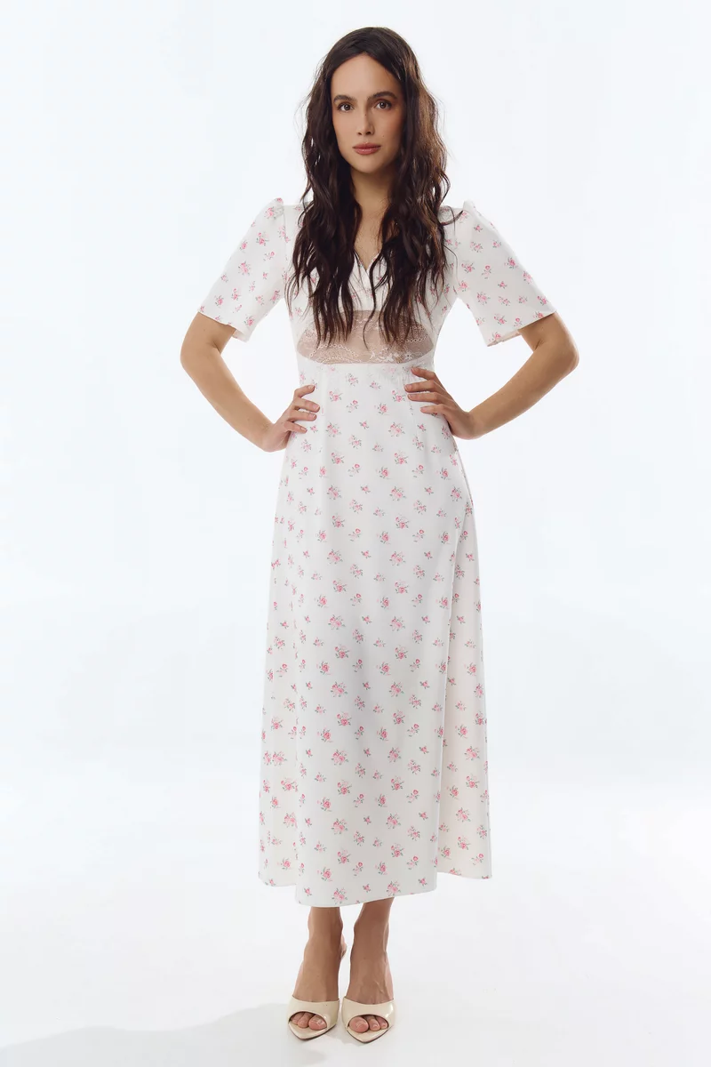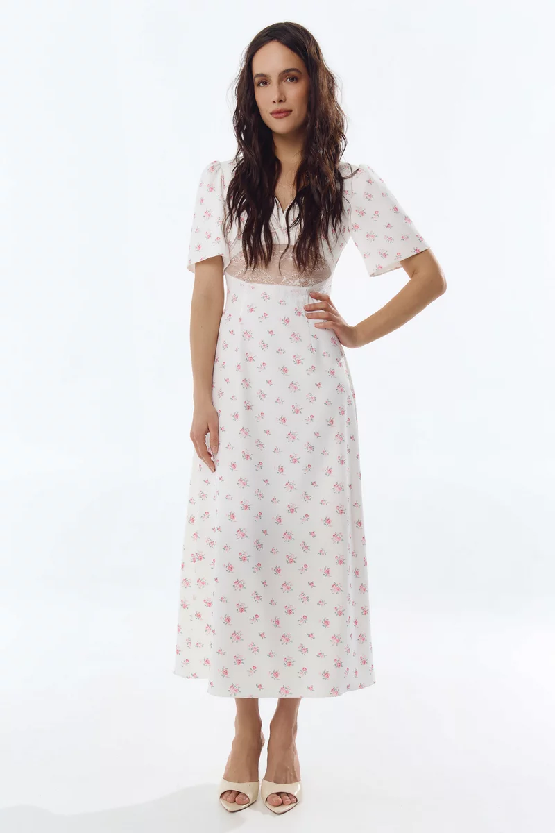 Сукня міді виконана із приємного до тіла сатину. Акцентна деталь - ніжна мереживна вставка. Модель злегка розкльошеного крою. На шовковій підкладці