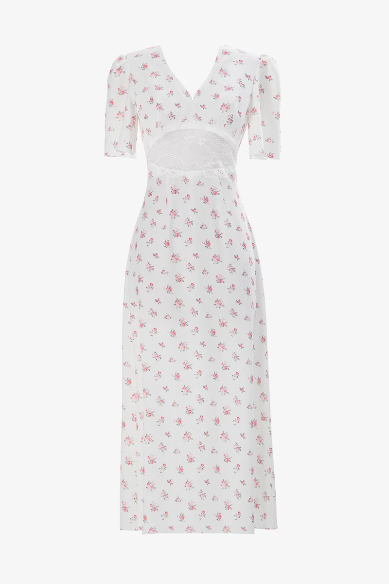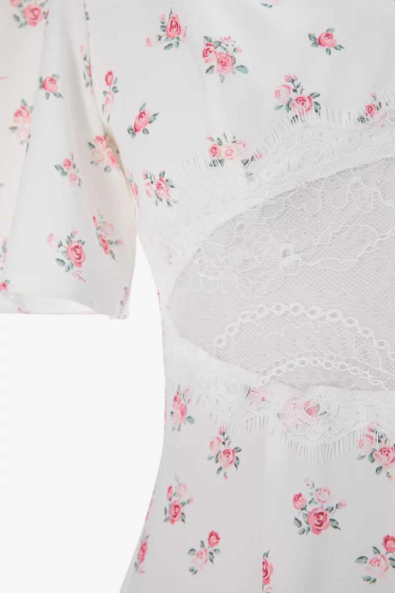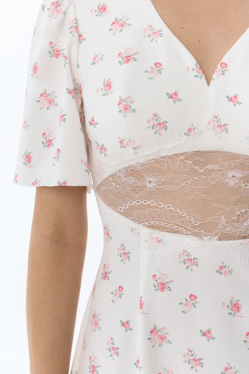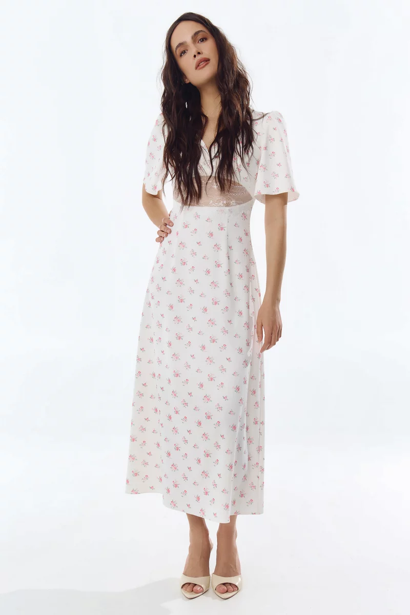 Сукня міді виконана із приємного до тіла сатину. Акцентна деталь - ніжна мереживна вставка. Модель злегка розкльошеного крою. На шовковій підкладці