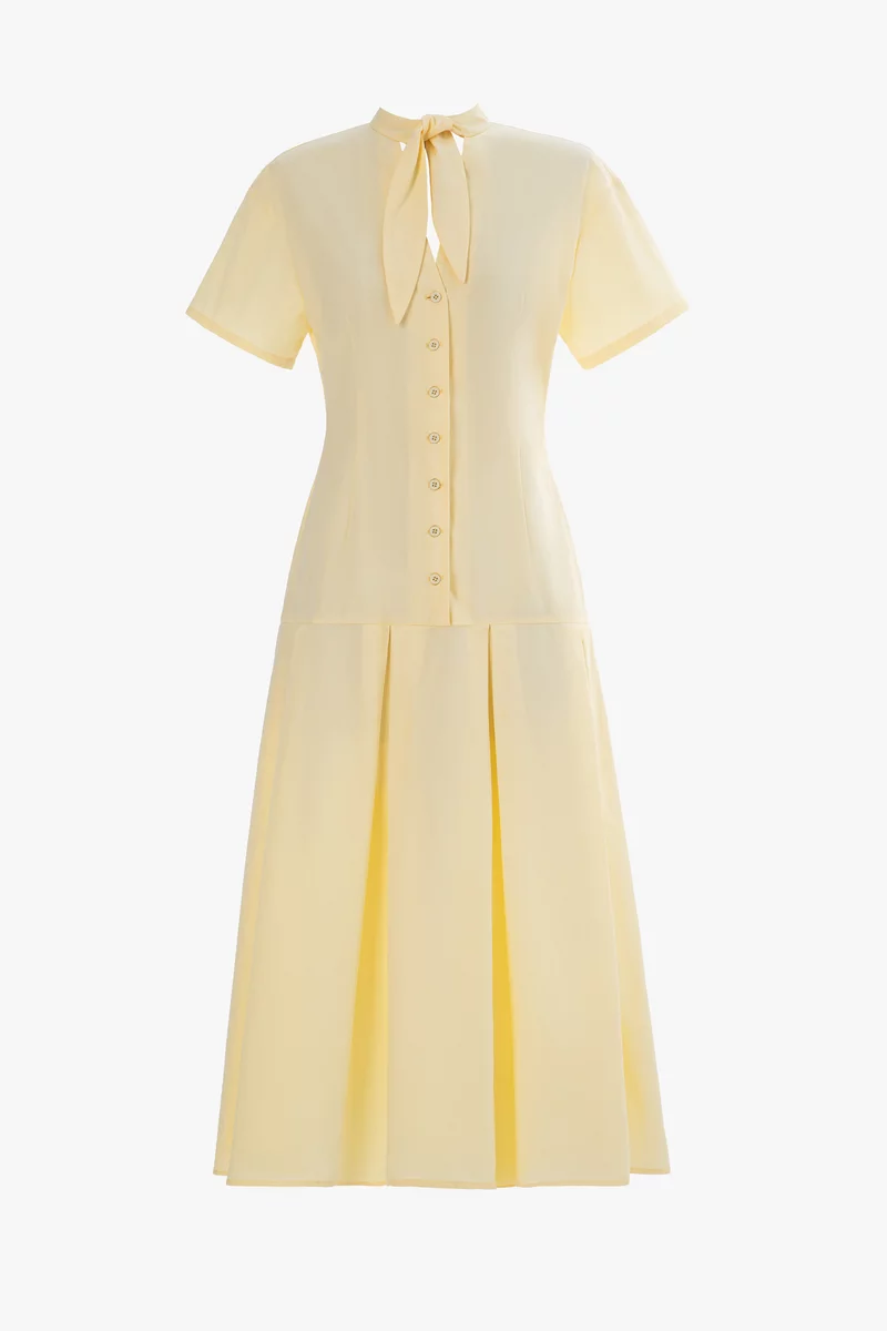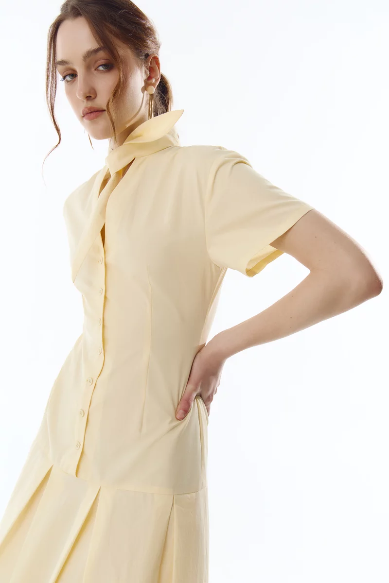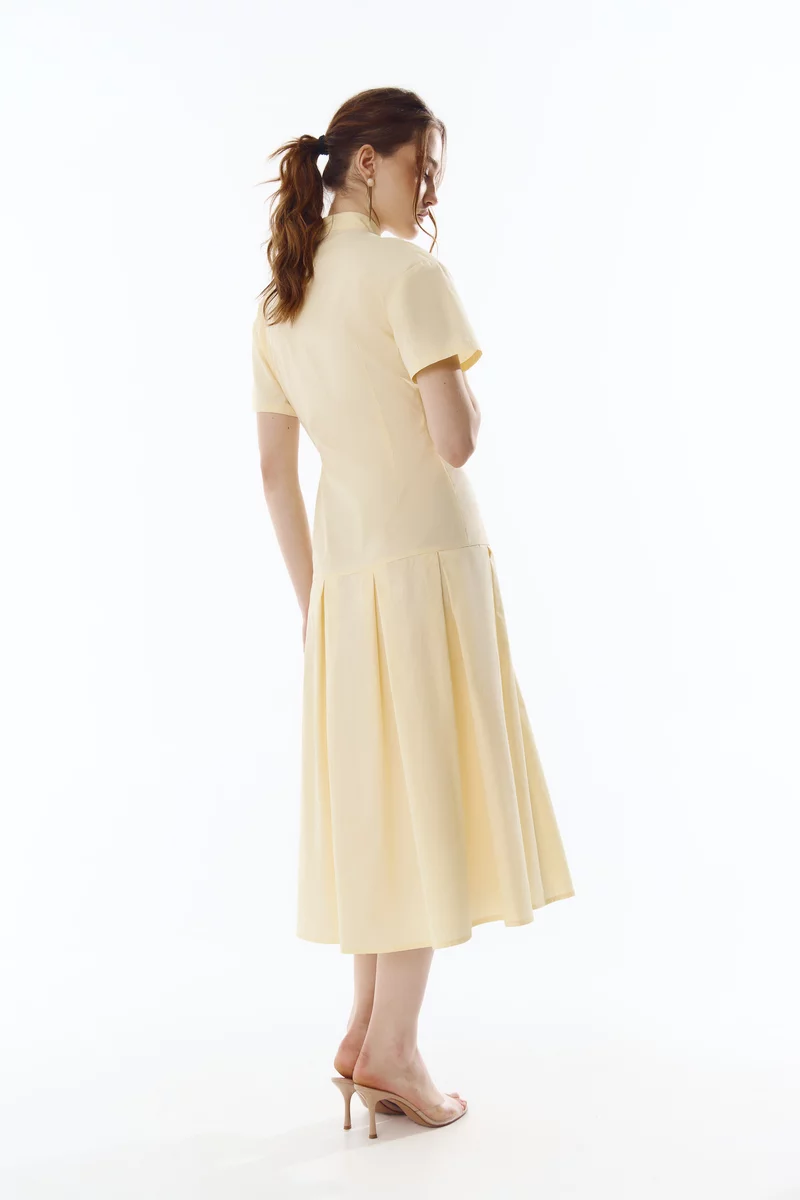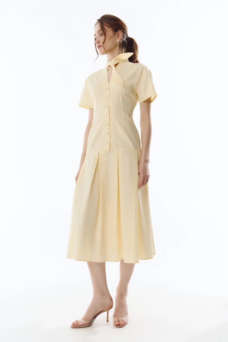 Сукня міді зі 100% бавовни із заниженою талією. Модель із коміром-стійкою на зав'язці, що дозволяє створювати різні образи. Сукня із коротким рукавом та розкльошеною спідницею