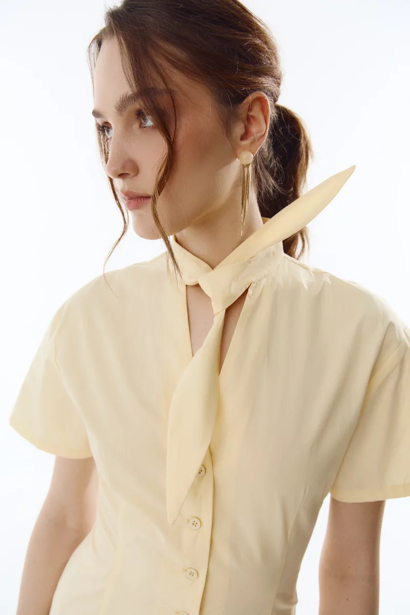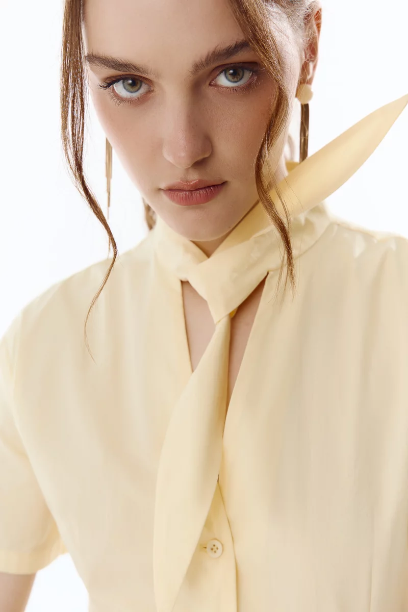 Жовта бавовняна сукня міді з акцентною зав'язкою