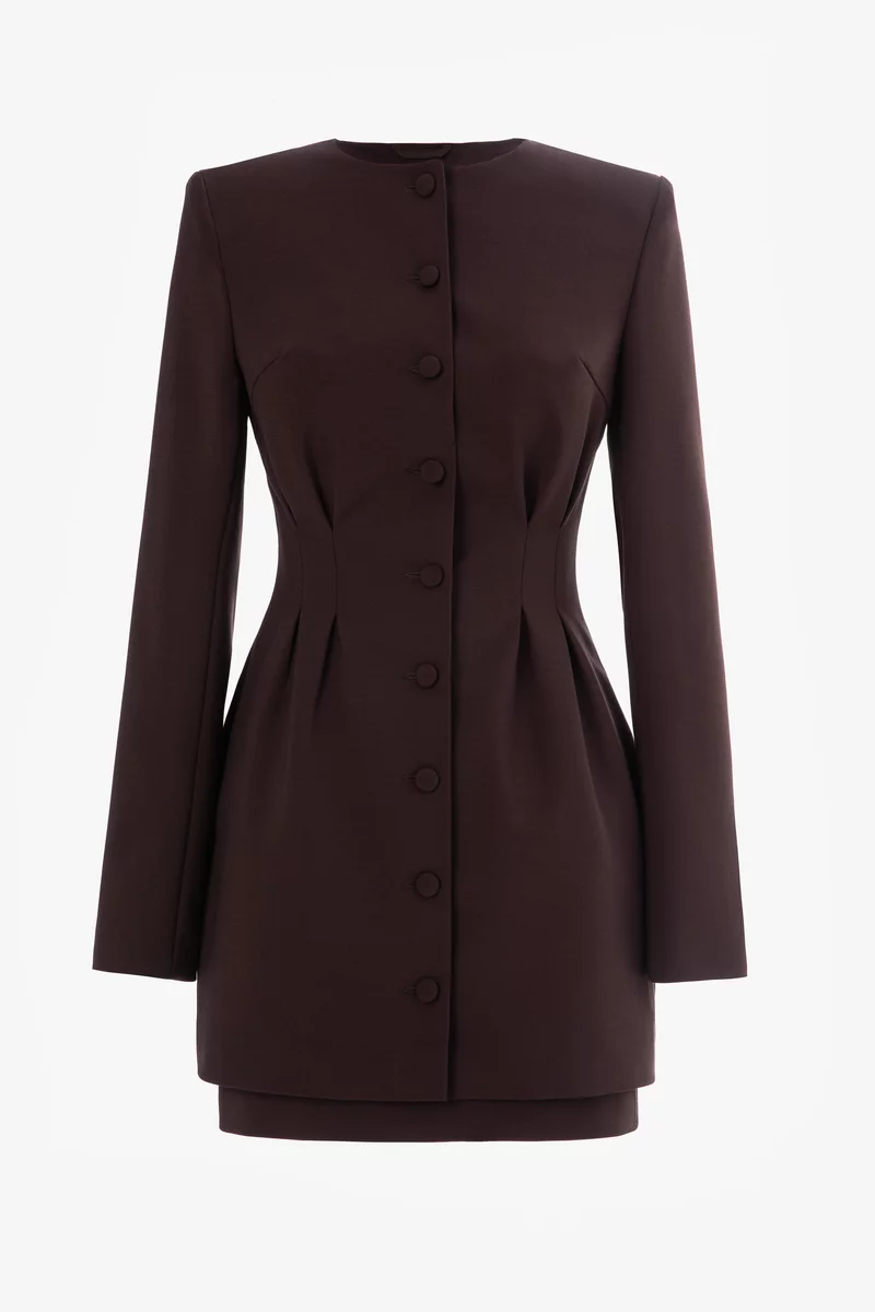 Сукня міні з костюмної тканини. У комплекті коротка спідниця, яку можна носити як окремий елемент гардеробу. Модель із прямим довгим рукавом та підкресленою талією. Застібається на гудзики спереду. У плечах передбачені додаткові вставки для збереження строгих ліній. На підкладці