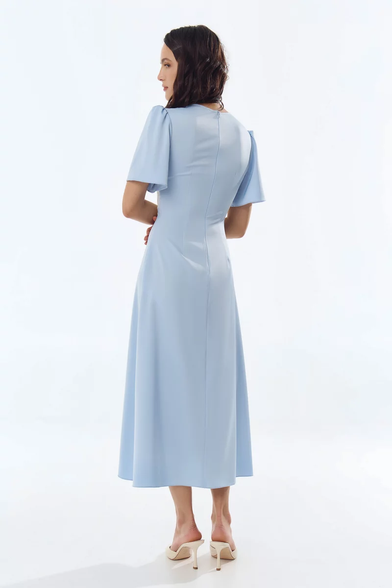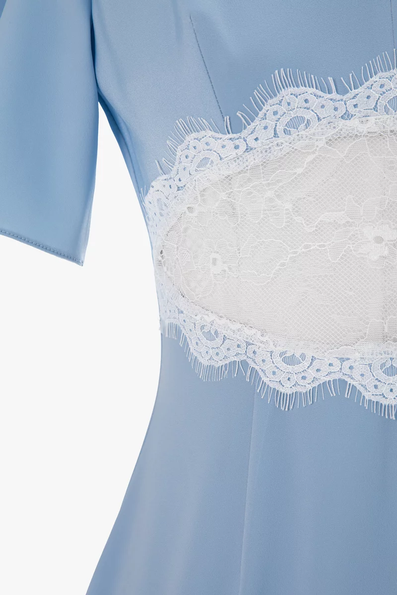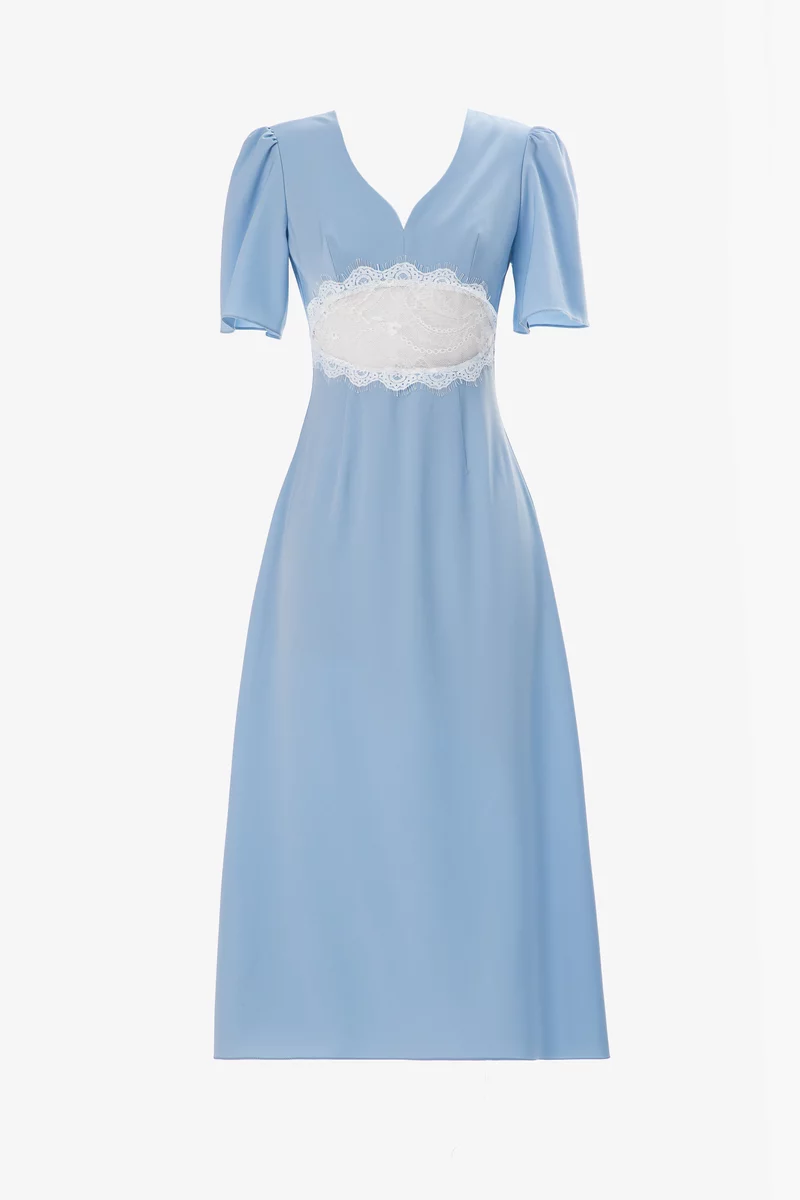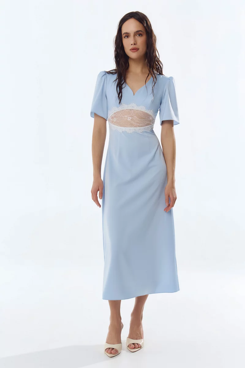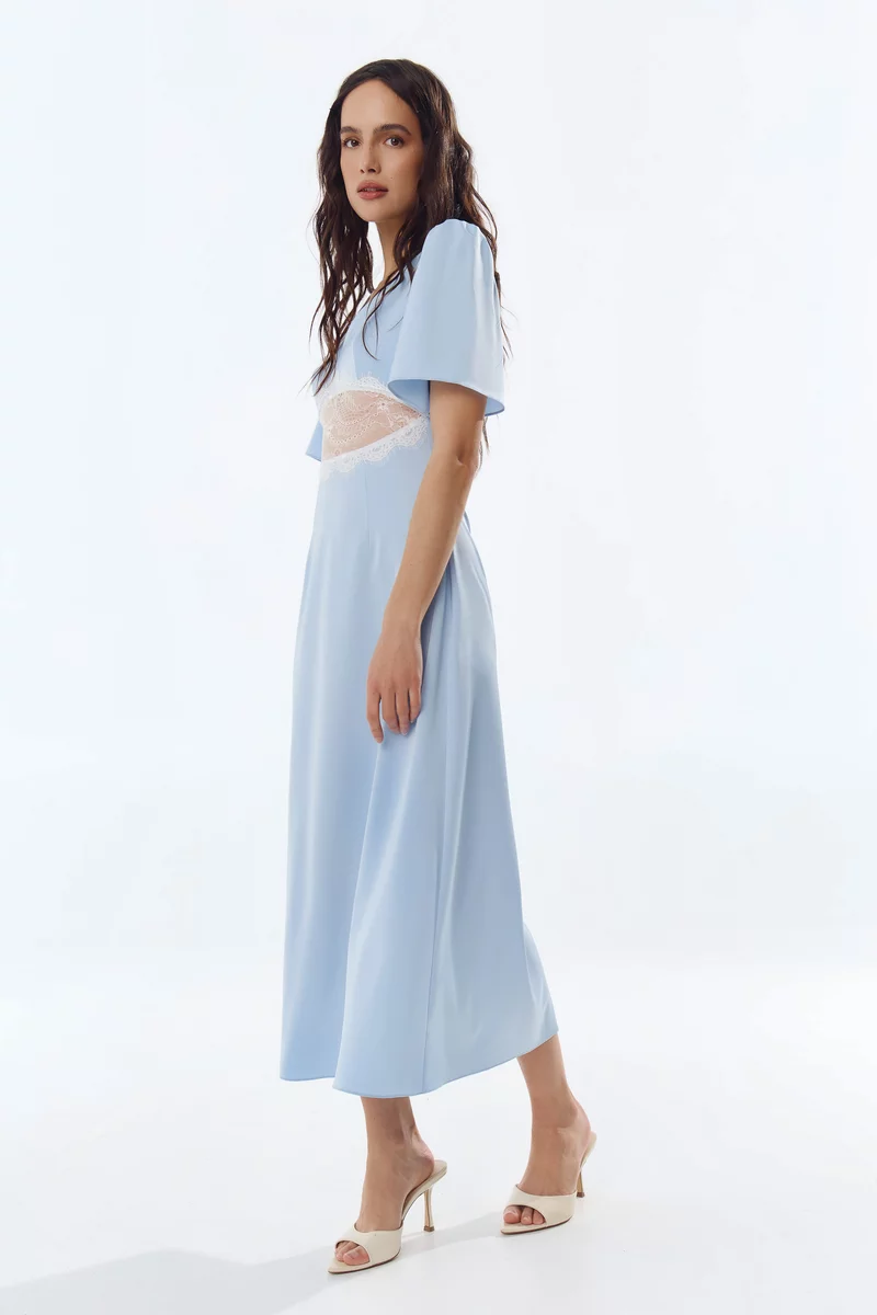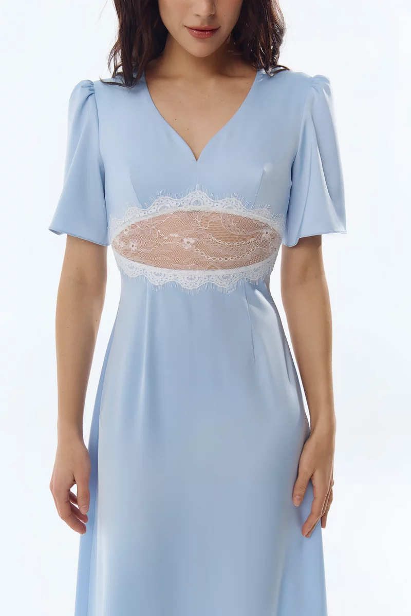Сукня міді виконана із приємного до тіла сатину. Акцентна деталь - ніжна мереживна вставка. Модель злегка розкльошеного крою. На шовковій підкладці