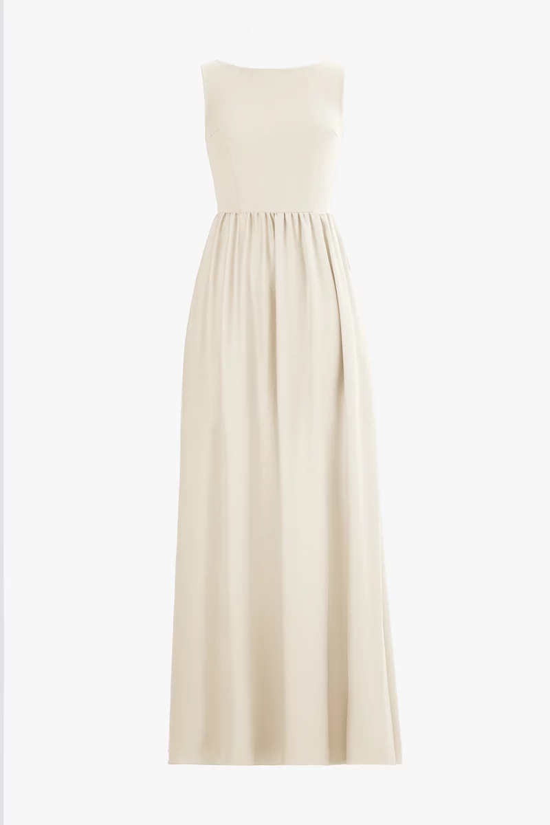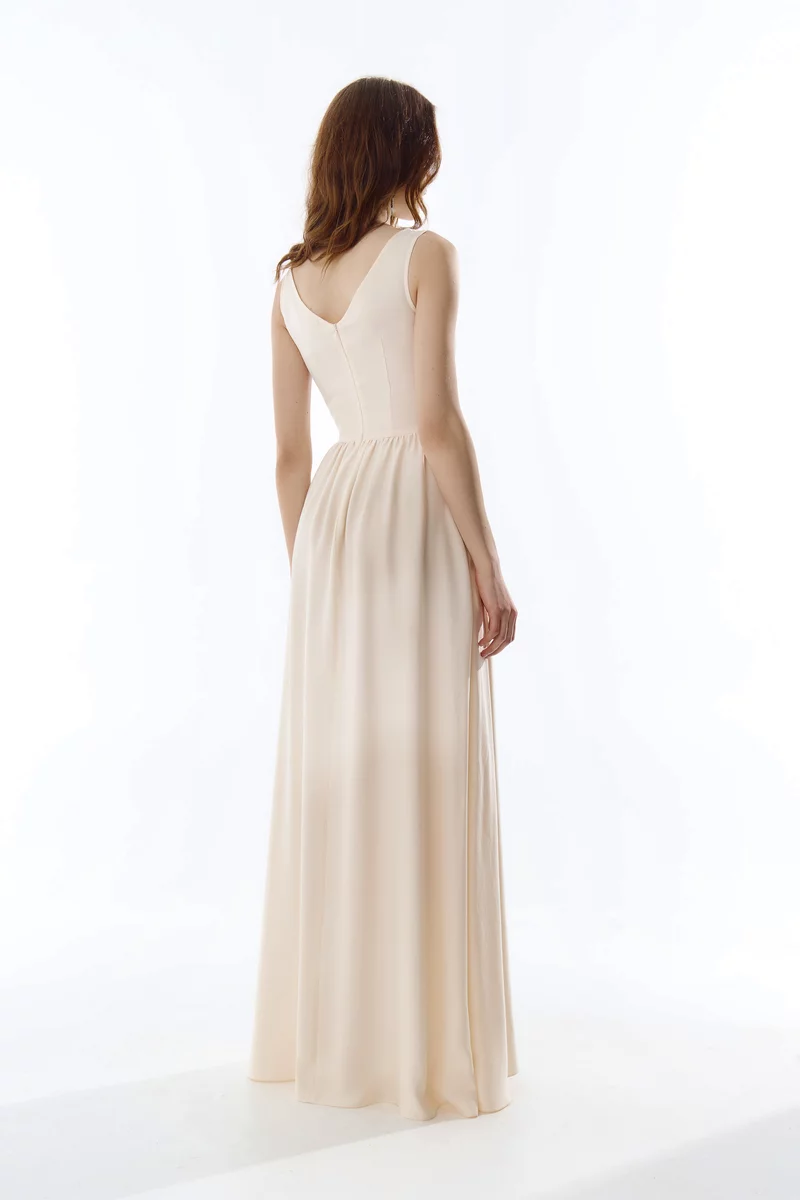 Сукня максі із підкресленою талією та розкльошеною спідницею. Модель із прорізними бічними кишенями. Застібається на приховану блискавку ззаду