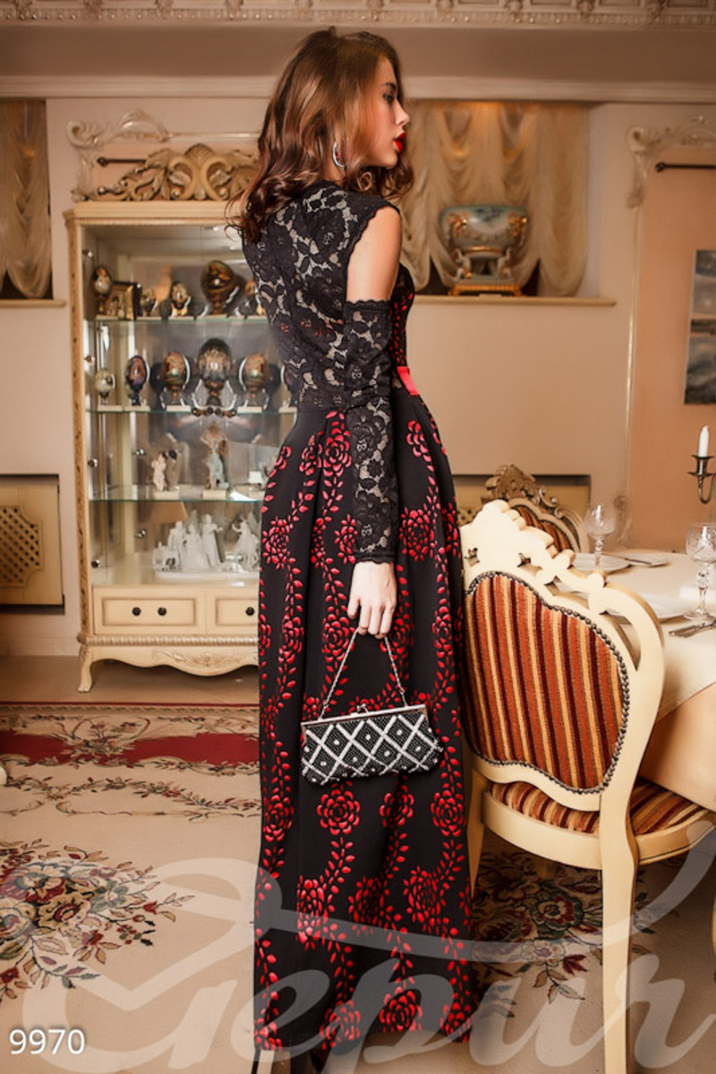 Платье вечернее в пол из перфорированной кукурузы в форме роз на атласной основе. Платье украшено атласной вставкой на талии. Спина и декольте из гипюра. К платью в комплекте идут два гипюровых рукава. Материал: кукуруза, атлас, гипюр Длина: 148см Цвет: черный, атласная основа: красный