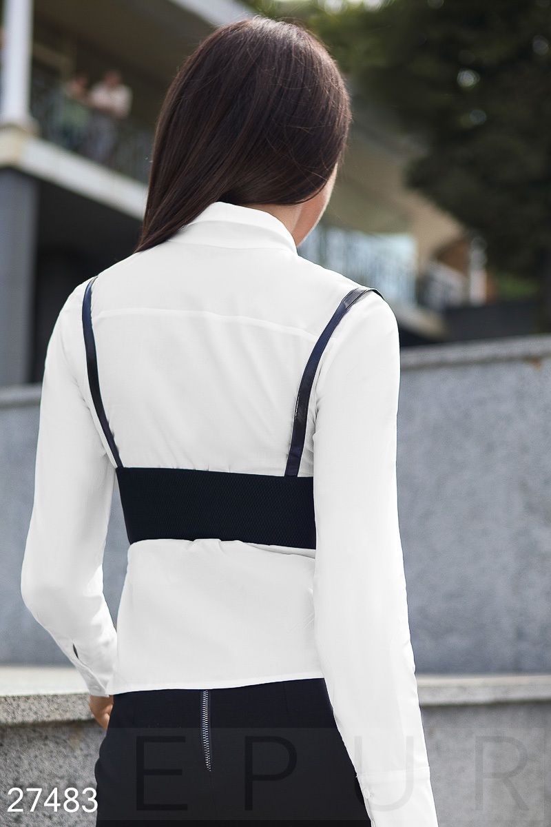 Стильная портупея-корсет, выполненная из мягкой эко-кожи: узкие регулируемые бретели, декоративные пряжки спереди и широкая эластичная вставка на спинке, позволяющая регулировать обхват талии.