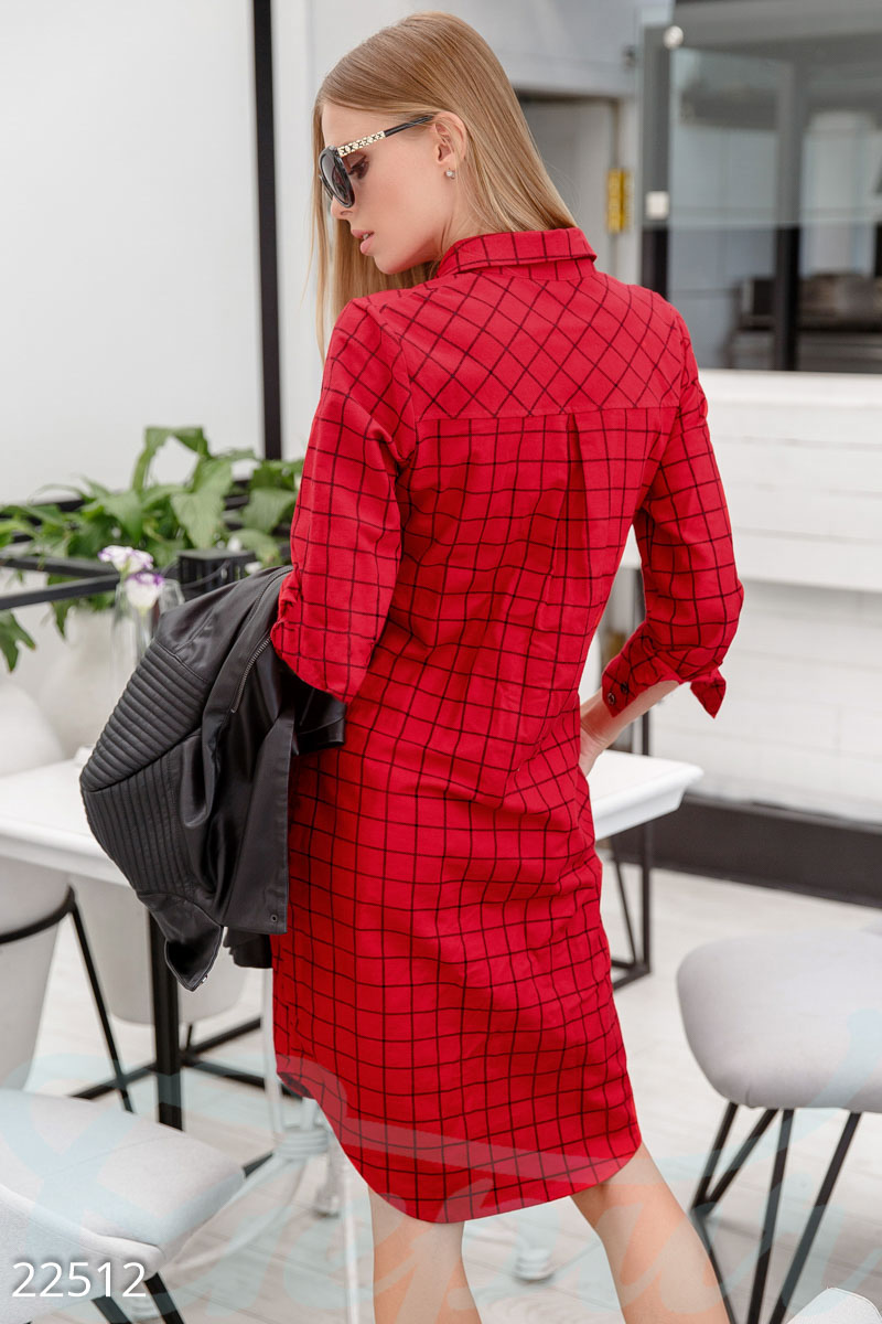 Демисезонное платье-рубашка в клетку из яркой байки с закругленным подолом, разрезами по бокам, двумя нагрудными и двумя прорезными карманами по бокам.