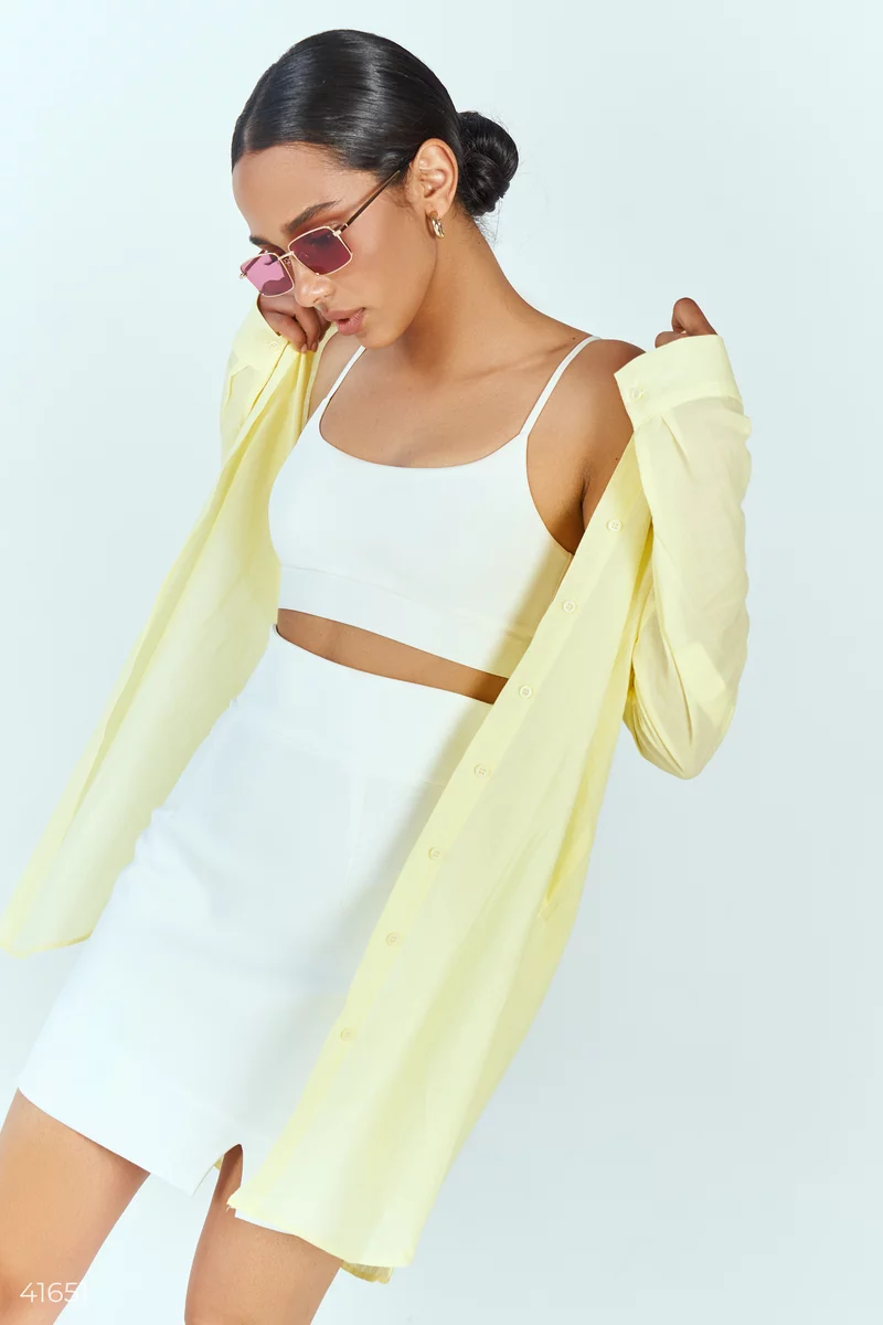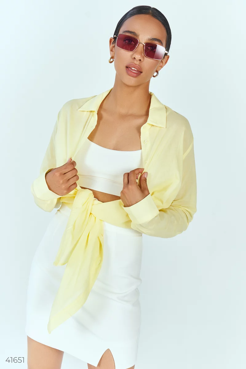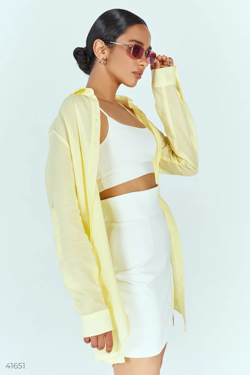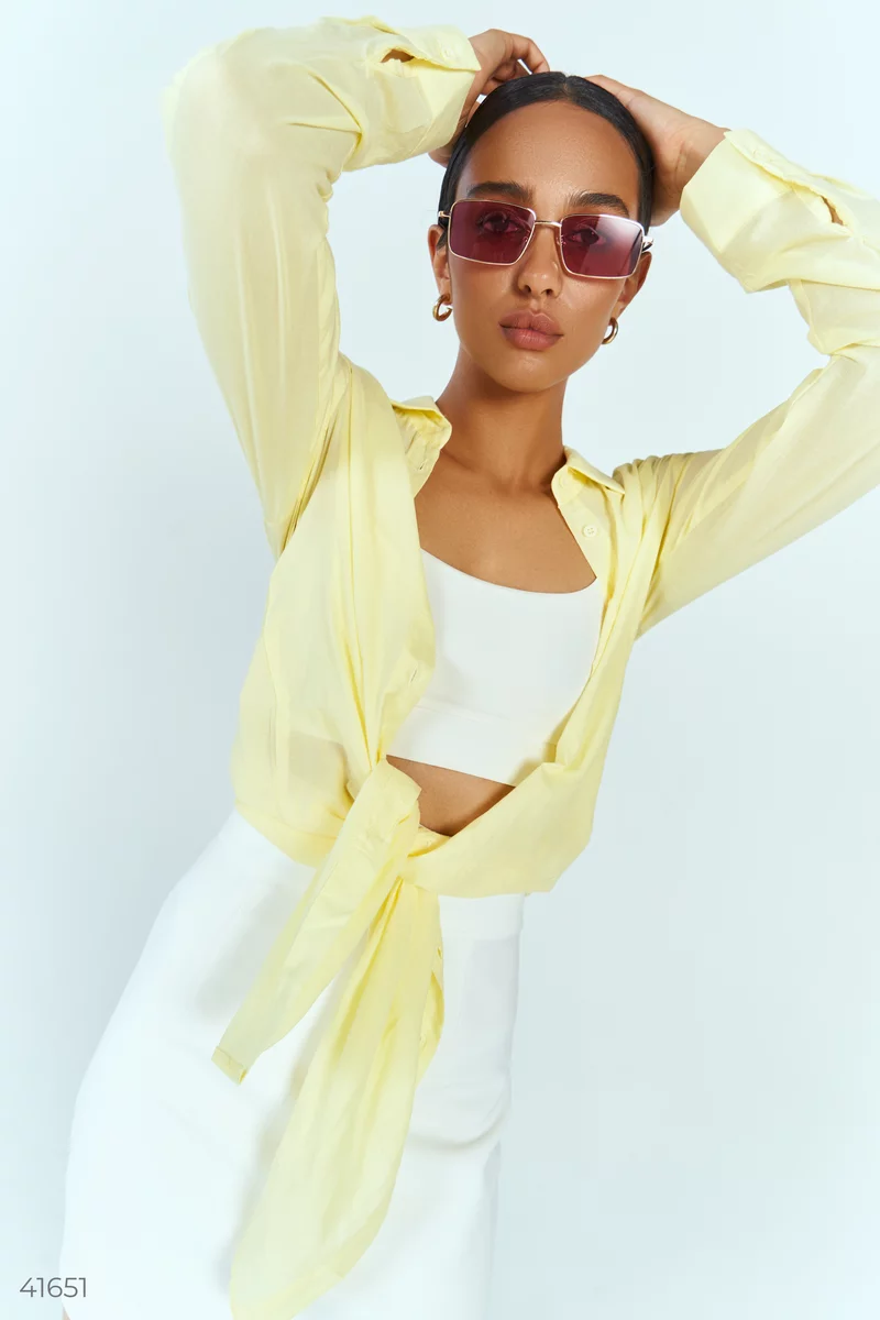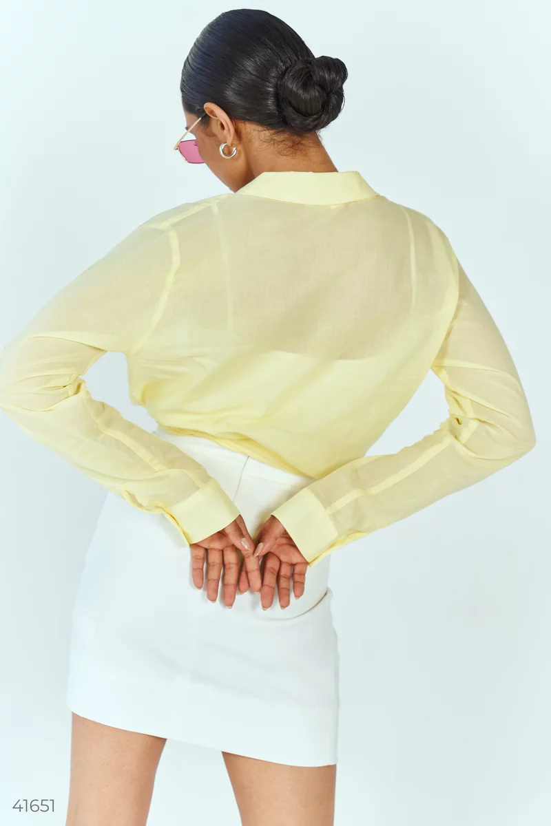 Повітряна подовжена сорочка із бавовняної тканини лимонного кольору. М'який відкладний комір, довгий рукав і застібка на гудзику по всій довжині.