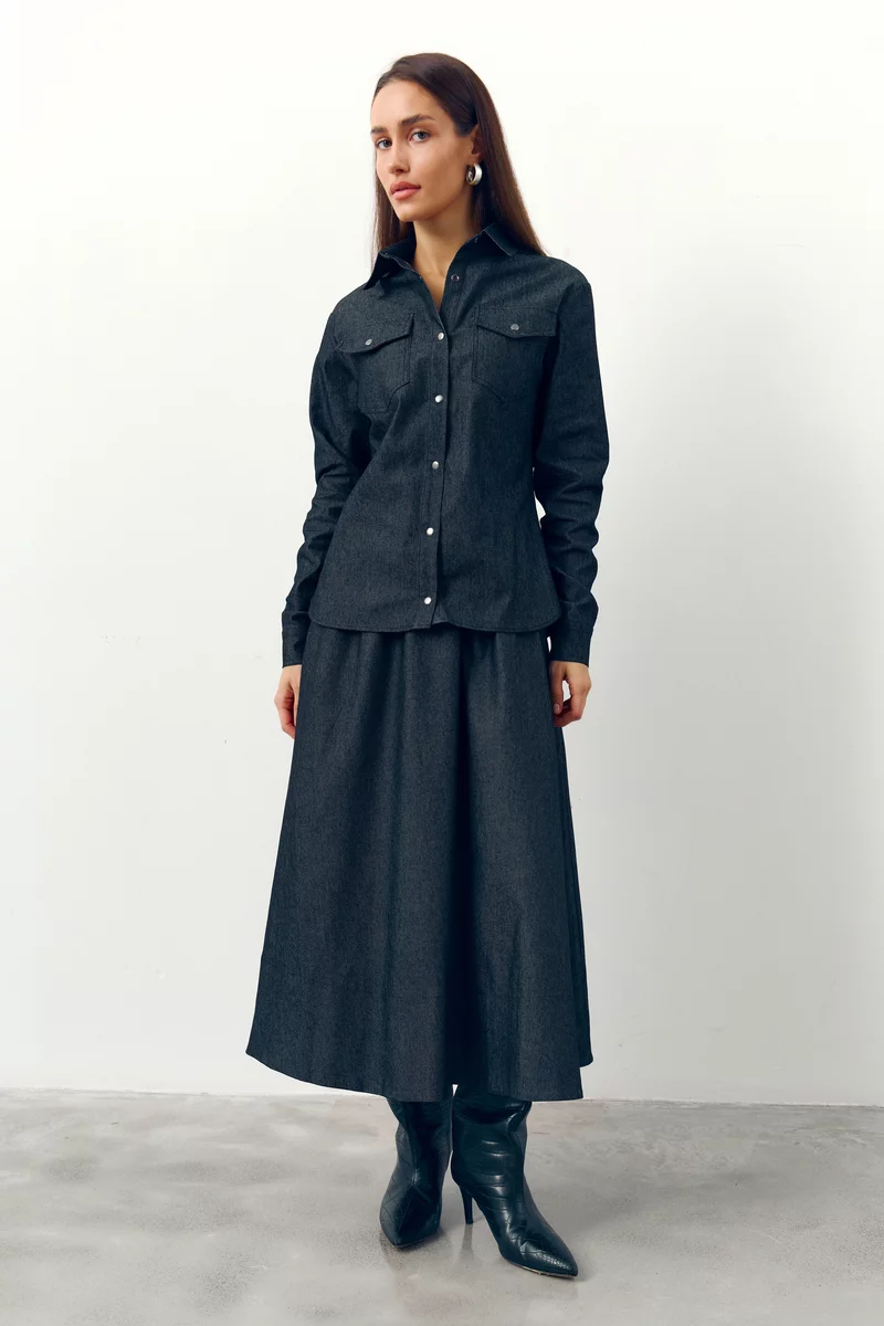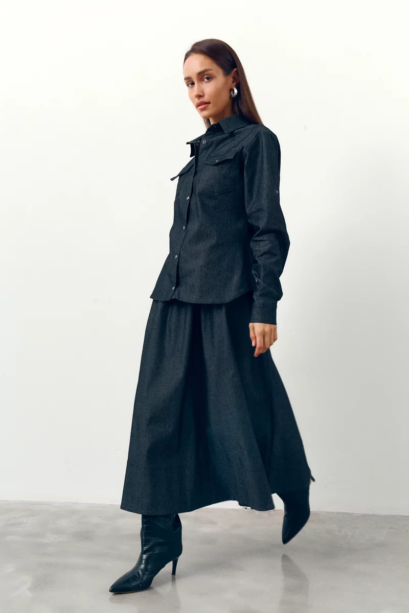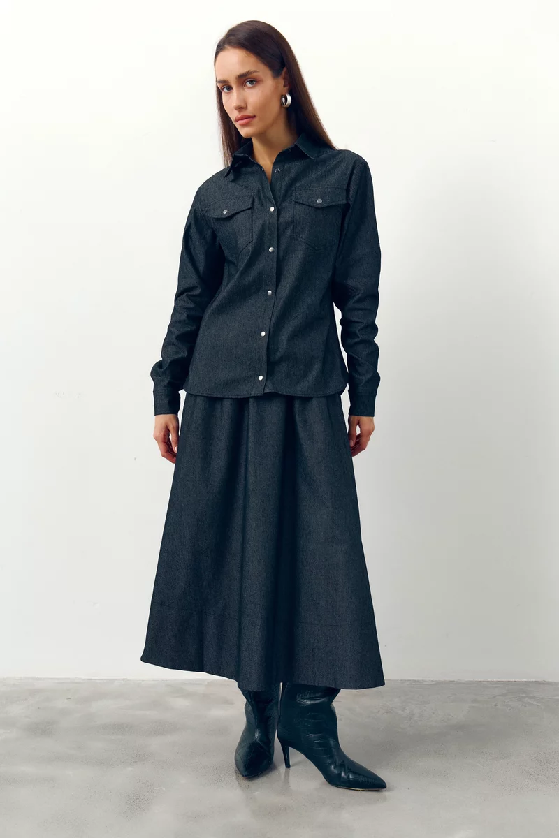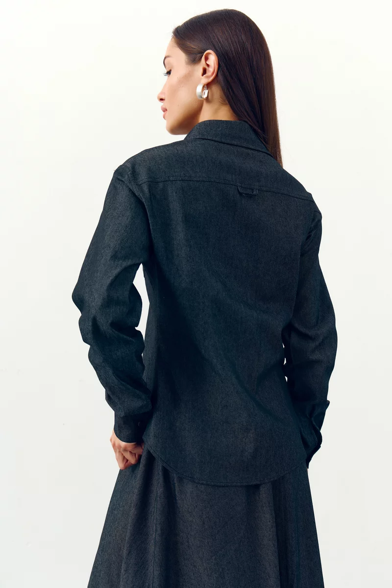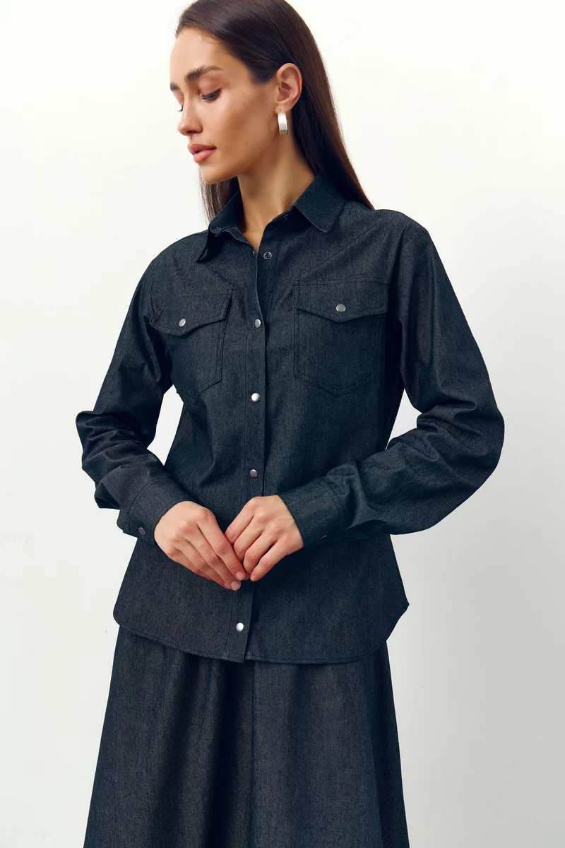 Джинсова сорочка зі щільного, але м’якого 100% котону. Відкладний комір, довгий рукав та закруглений поділ. Сорочка та манжети застібаються на кнопки