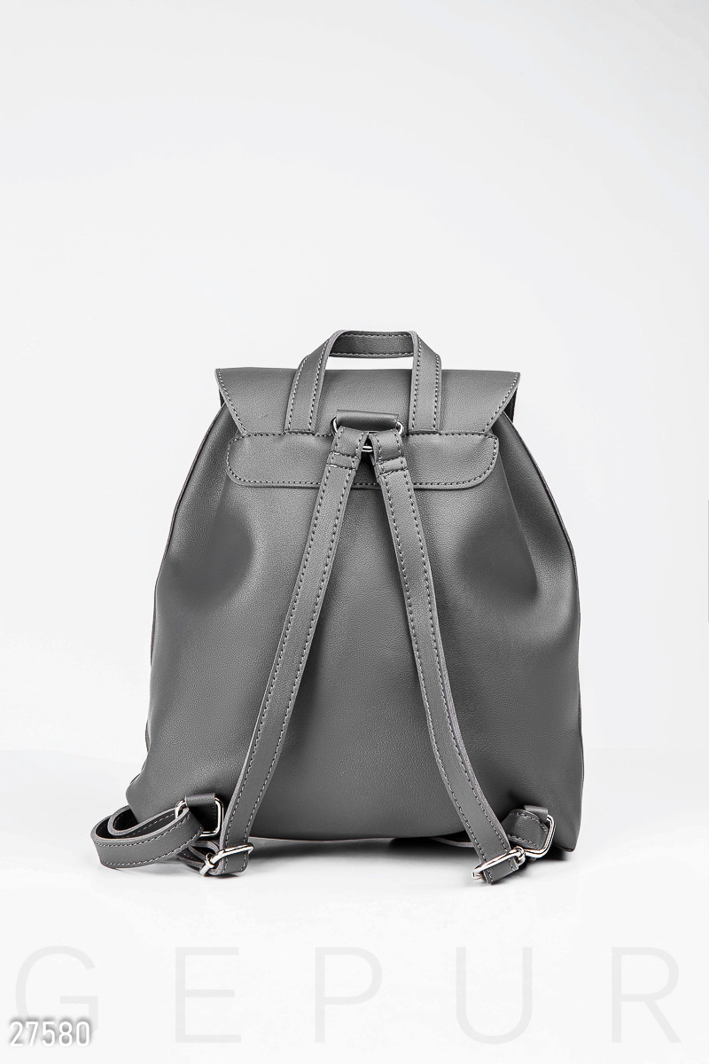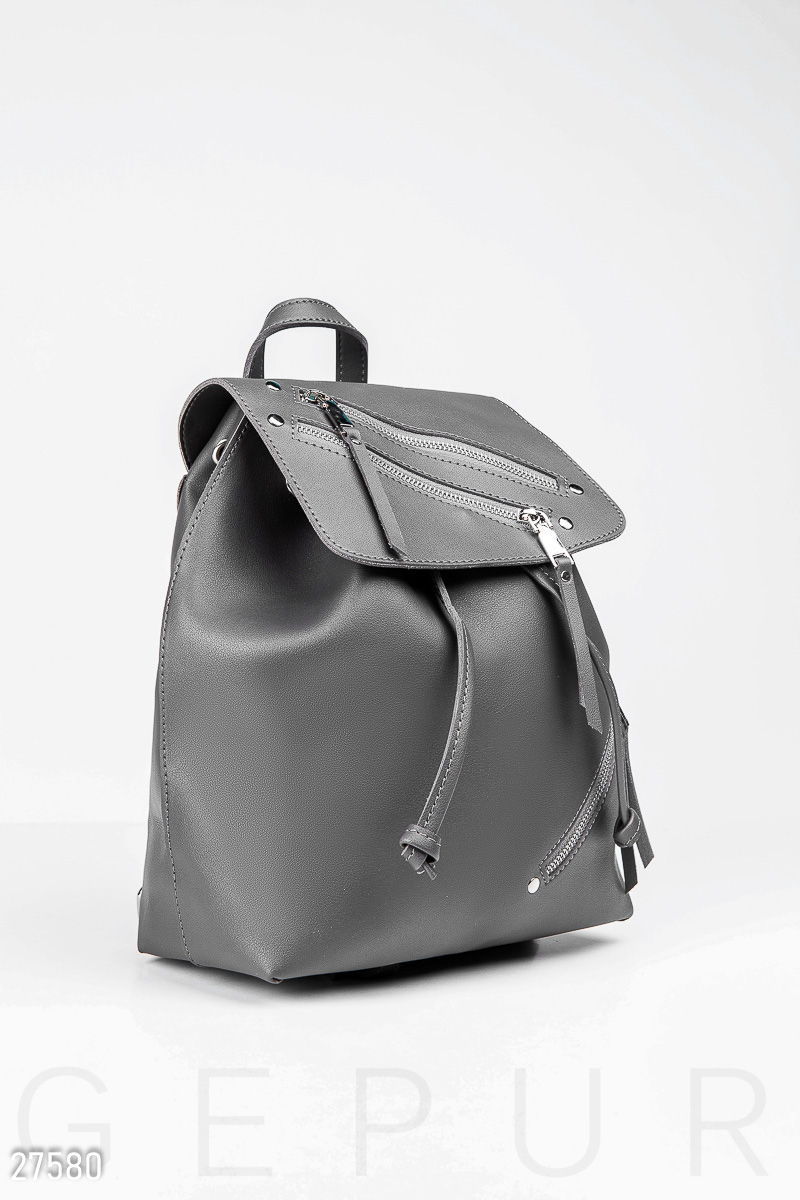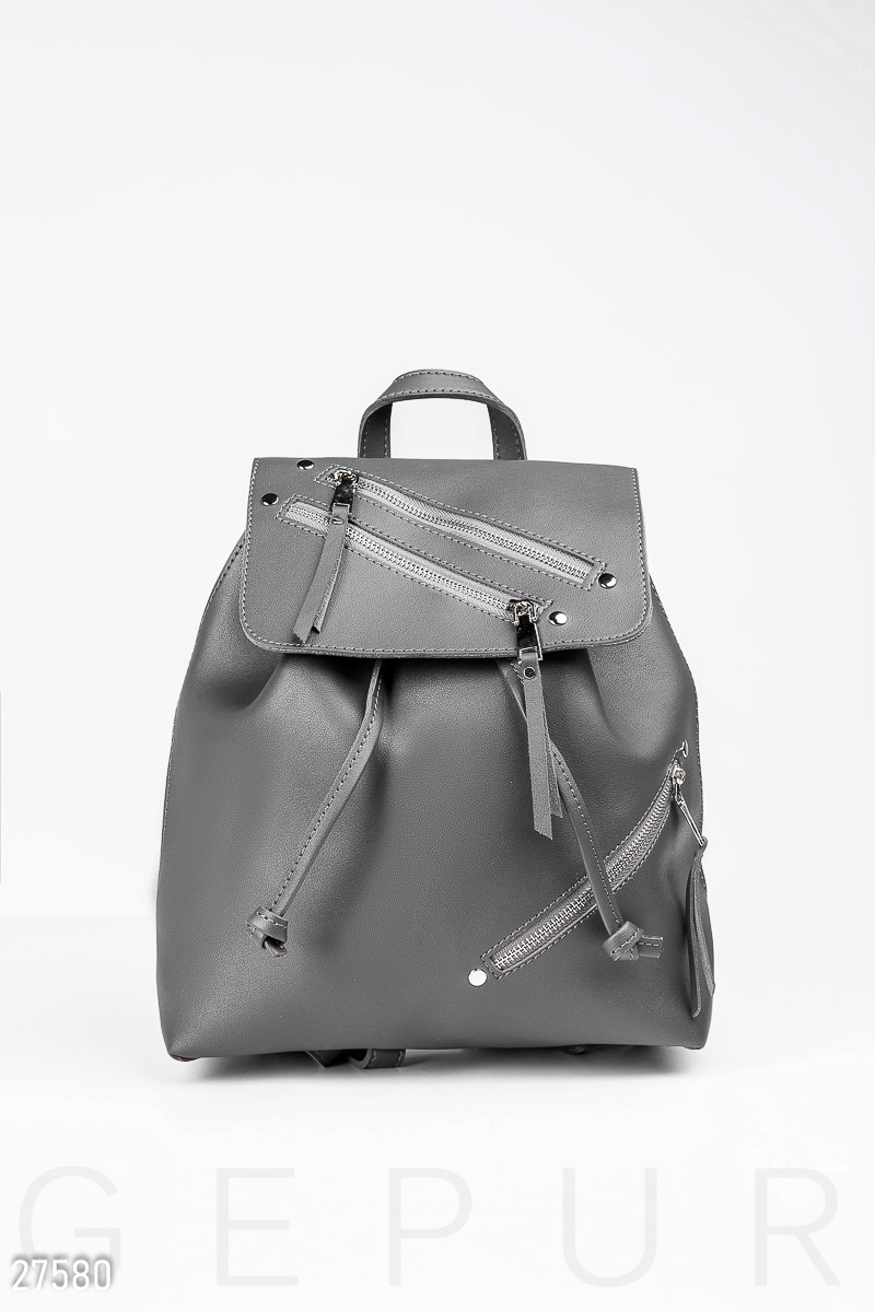 Городской рюкзак с клапаном-застежкой, украшенным молниями и заклепками, завязками на кулиске, карманом-обманкой спереди.