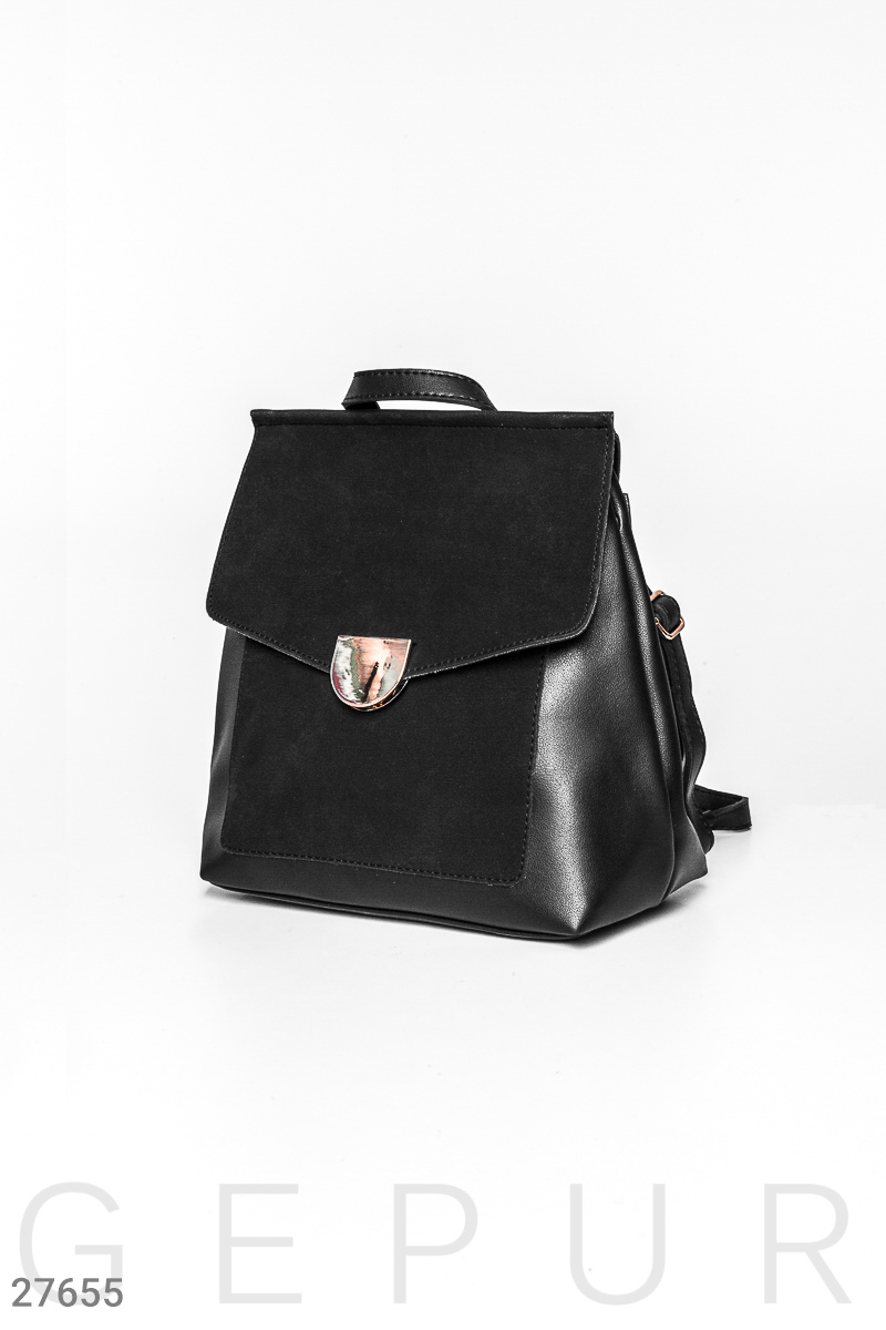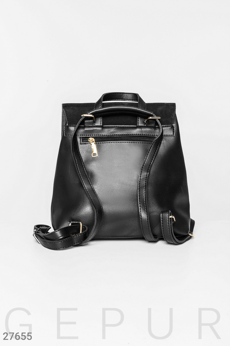 Городской рюкзак с застежкой-клапаном с фактурным акцентом, небольшим карманом на молнии сзади, регулируемыми лямками, которые легко трансформируются в плечевой ремешок. Внутри одно отделение на молнии с двумя маленькими открытыми карманами и одним боковым на молнии.