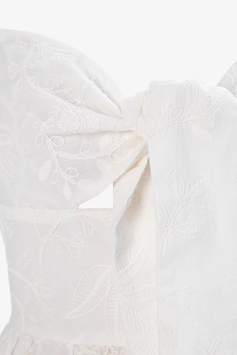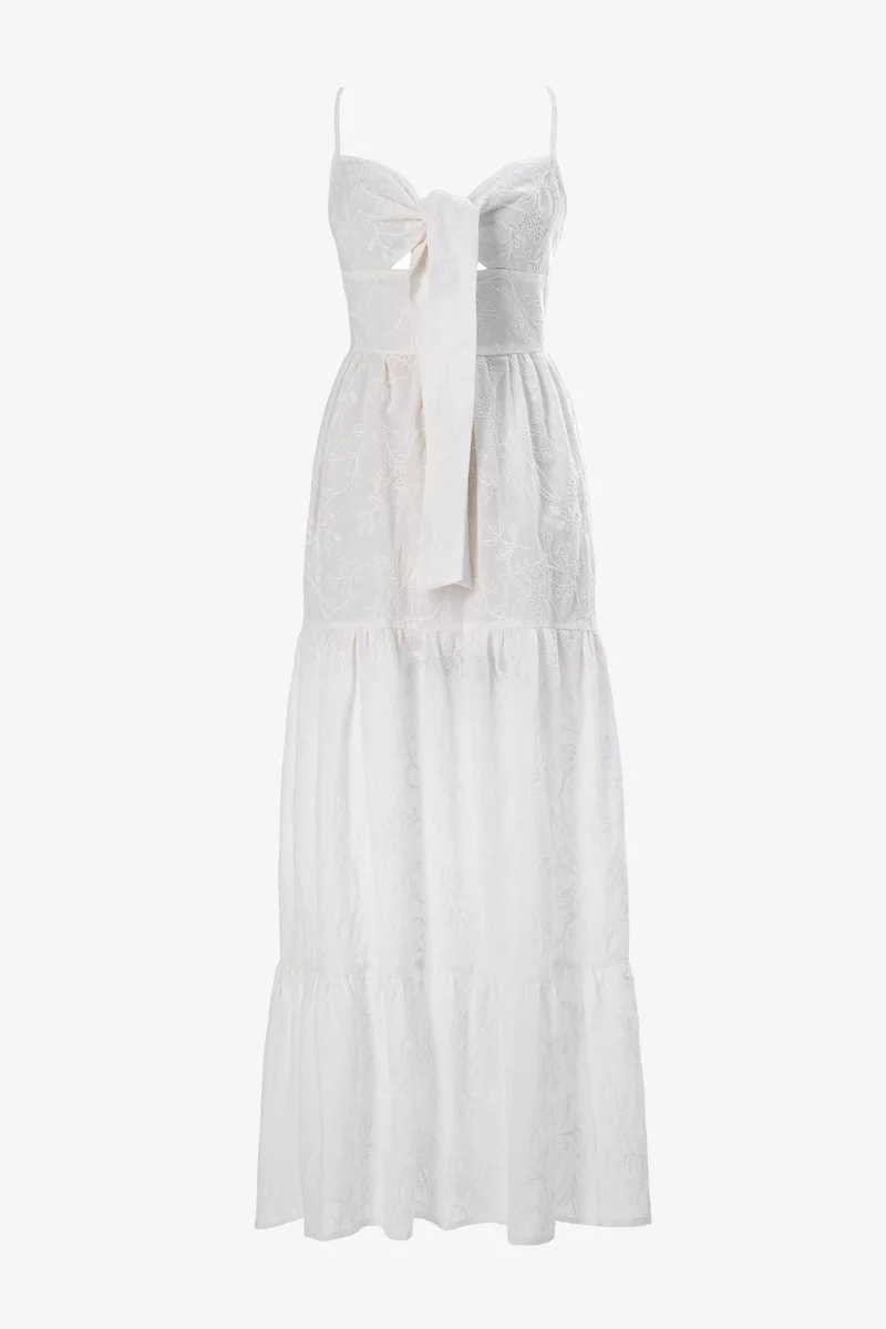 Легкий сарафан максі із натуральної бавовняної тканини. Модель стилізована розкльошеною спідницею з воланами і ліфом на зав'язці. Застібається на приховану блискавку ззаду. На бавовняній підкладці
